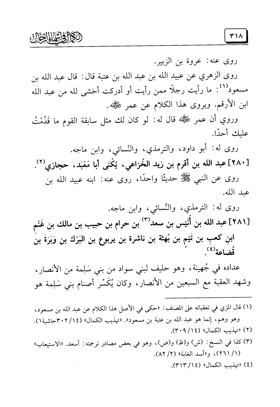 (¬١) قال المزي في تعقباته على المصنف: "حكي في الأصل هذا الكلام عن عبد الله بن مسعود، وهو وهم، إنما هو عبد الله بن عتبة بن مسعود". "تهذيب الكمال" (١٤/ ٣٠٢ حاشية ١).