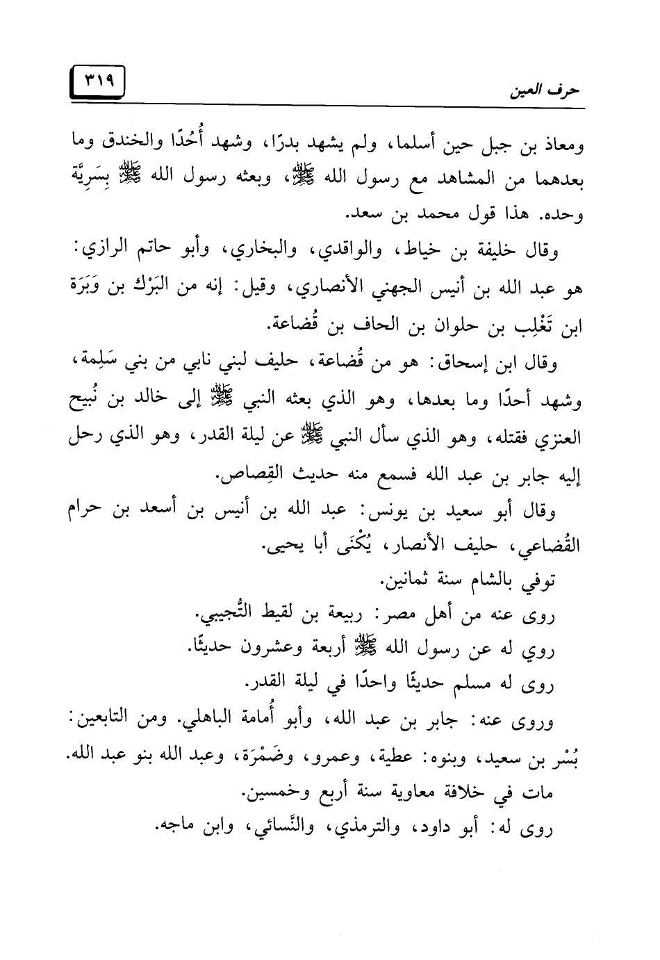 ومعاذ بن جبل حين أسلما، ولم يشهد بدرًا، وشهد أُحُدًا والخندق وما بعدهما من المشاهد مع رسول الله -صَلَّى اللهُ عَلَيْهِ وَسَلَّمَ-، وبعثه رسول الله -صَلَّى اللهُ عَلَيْهِ وَسَلَّمَ- بِسَرِيَّة وحده. هذا قول محمد بن سعد.