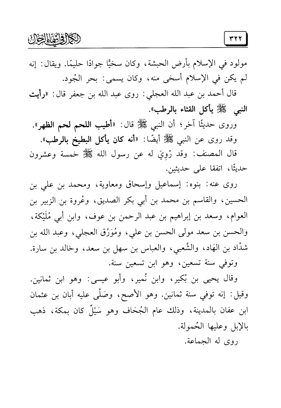 قال أحمد بن عبد الله العجلي: روى عبد الله بن جعفر قال: "رأيت النبي -صَلَّى اللهُ عَلَيْهِ وَسَلَّمَ- يأكل القثاء بالرطب".