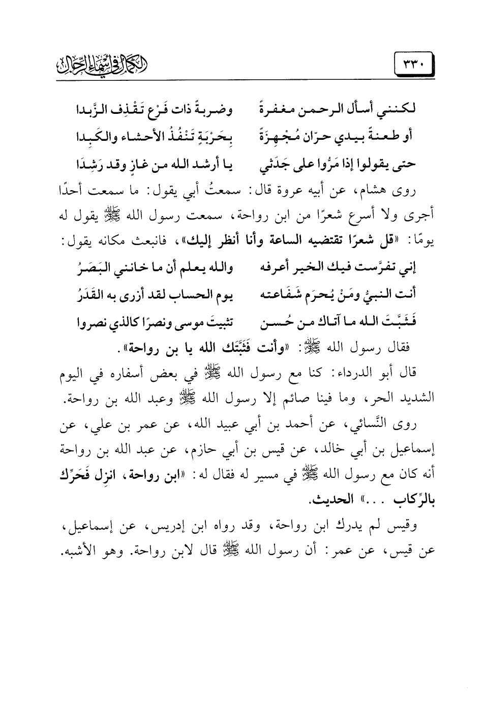 روي هشام، عن أبيه عروة قال: سمعتُ أبي يقول: ما سمعت أحدًا أجرى ولا أسرع شعرًا من ابن رواحة، سمعت رسول الله -صَلَّى اللهُ عَلَيْهِ وَسَلَّمَ- يقول له يومًا: "قل شعرًا تقتضيه الساعة وأنا أنظر إليك"، فانبعث مكانه يقول: