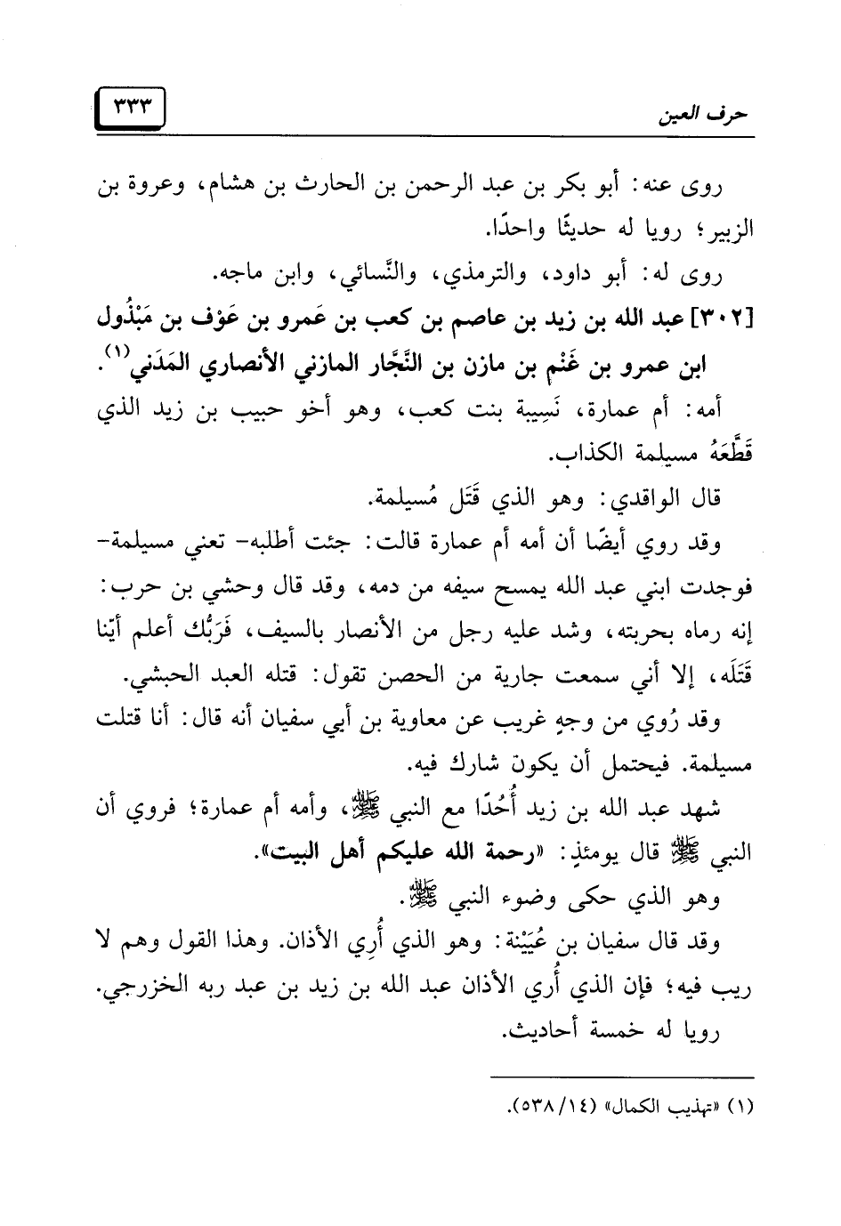 [٣٠٢] عبد الله بن زيد بن عاصم بن كعب بن عَمرو بن عَوْف بن مَبْذُول ابن عمرو بن غَنْم بن مازن بن النَّجَّار المازني الأنصاري المَدَني (¬١).
