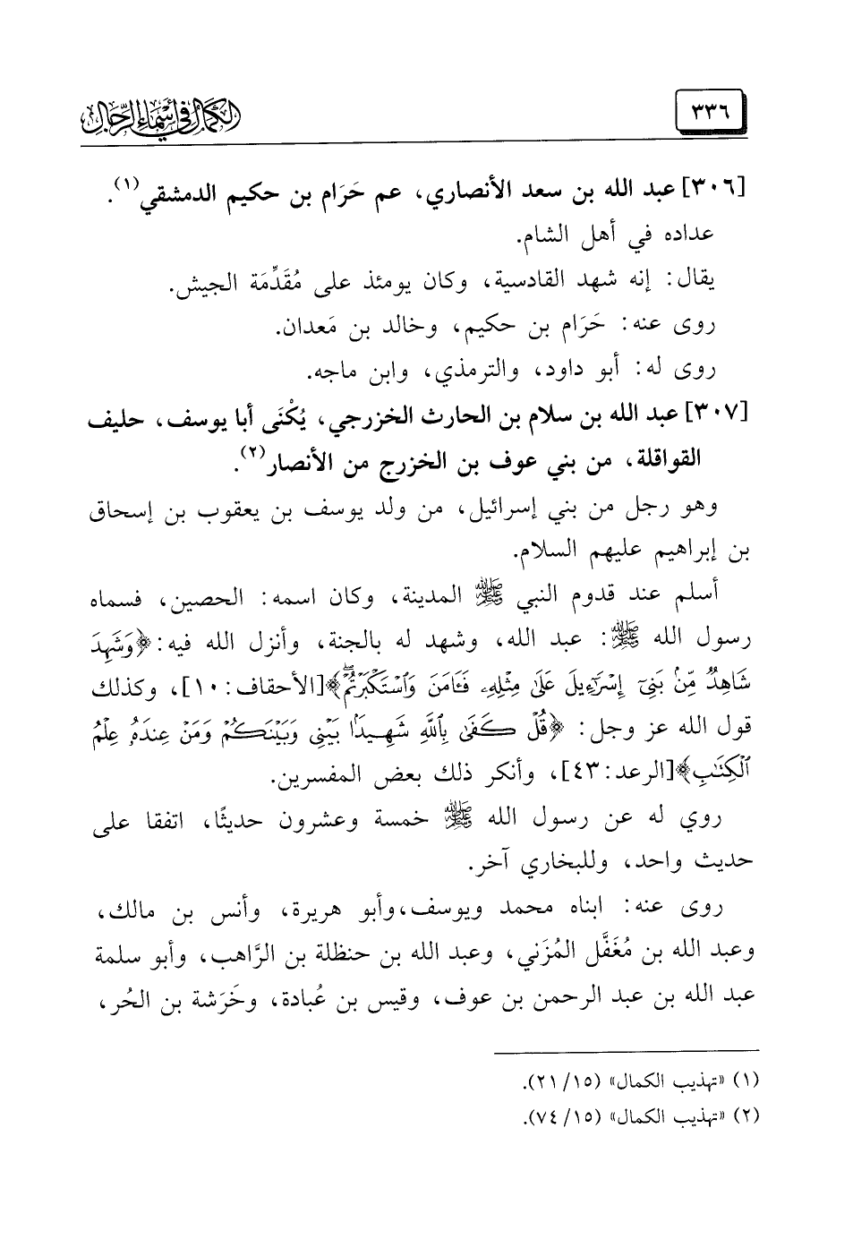 [٣٠٧] عبد الله بن سلام بن الحارث الخزرجي، يُكْنَى أبا يوسف، حليف القواقلة، من بني عوف بن الخزرج من الأنصار (¬٢).