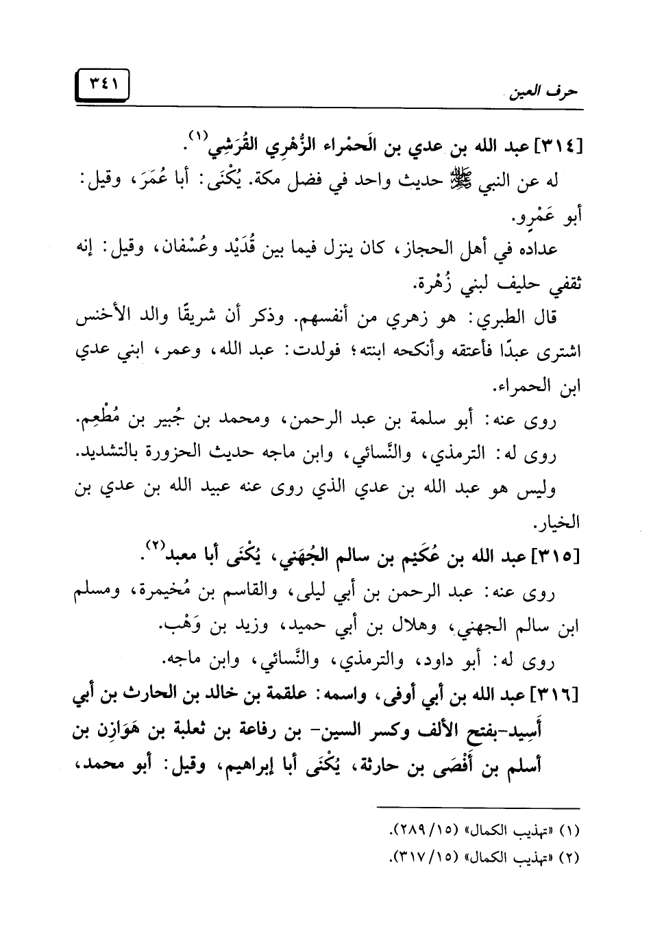 [٣١٦] عبد الله بن أبي أوفي، واسمه: علقمة بن خالد بن الحارث بن أبي أسيد -بفتح الألف وكسر السين- بن رفاعة بن ثعلبة بن هَوَازِن بن أسلم بن أَفْصى بن حارثة، يُكْنَى أبا إبراهيم، وقيل: أبو محمد،