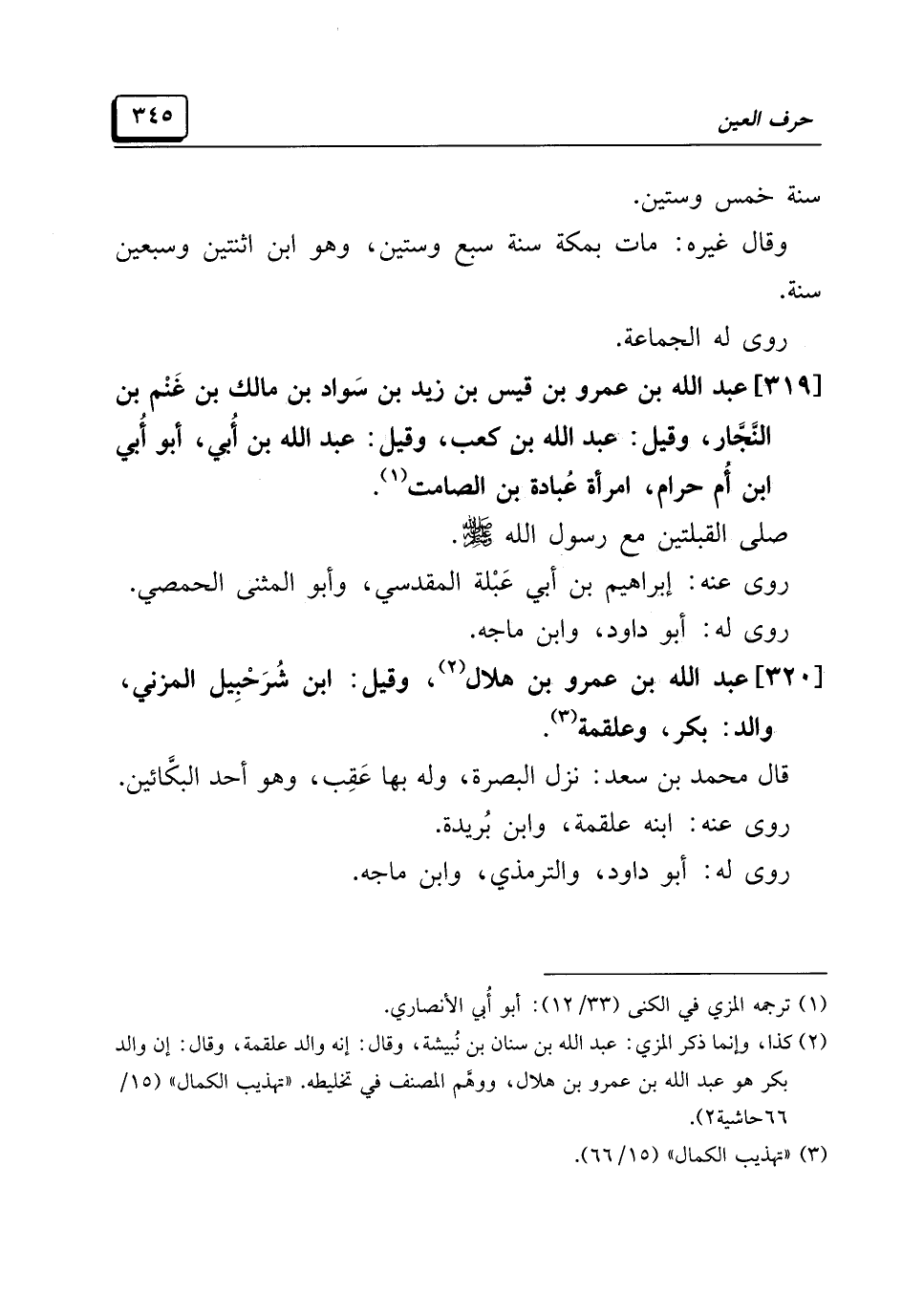 [٣٢٠] عبد الله بن عمرو بن هلال (¬٢)، وقيل: ابن شُرَحْبِيل المزني، والد: بكر، وعلقمة (¬٣).