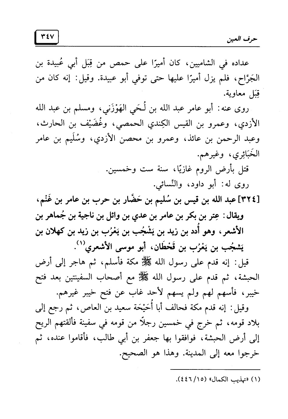 [٣٢٤] عبد الله بن قيس بن سُليم بن حَضَّار بن حرب بن عامر بن غَنْم، ويقال: عِتر بن بكر بن عامر بن عدي بن وائل بن ناجية بن جُماهر بن الأشعر، وهو أُدد بن زيد بن يَشْجُب بن يَعْرُب بن زيد بن كهلان بن يَشجُب بن يَعْرُب بن قَحْطَان، أبو موسى الأشعري (¬١).