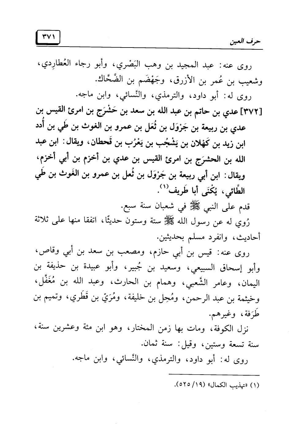 [٣٧٢] عدي بن حاتم بن عبد الله بن سعد بن حَشْرَج بن امرئ القيس بن عدي بن ربيعة بن جَرْوَل بن ثُعَل بن عمرو بن الغوث بن طَي بن أُدد ابن زيد بن كَهْلان بن يَشْجُب بن يَعْرُب بن قَحطان، ويقال: ابن عبد الله بن الحشرَج بن امرئ القيس بن عدي بن أخزم بن أبي أخزم، ويقال: ابن أبي ربيعة بن جَرْوَل بن ثُعل بن عمرو بن الغَوث بن طَي الطَّائي، يُكْنَى أبا طريف (¬١).