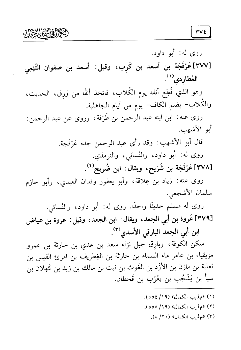 [٣٧٧] عَرْفَجَة بن أسعد بن كَرِب، وقيل: أسعد بن صفوان التَّيْمِي العُطاردي (¬١).