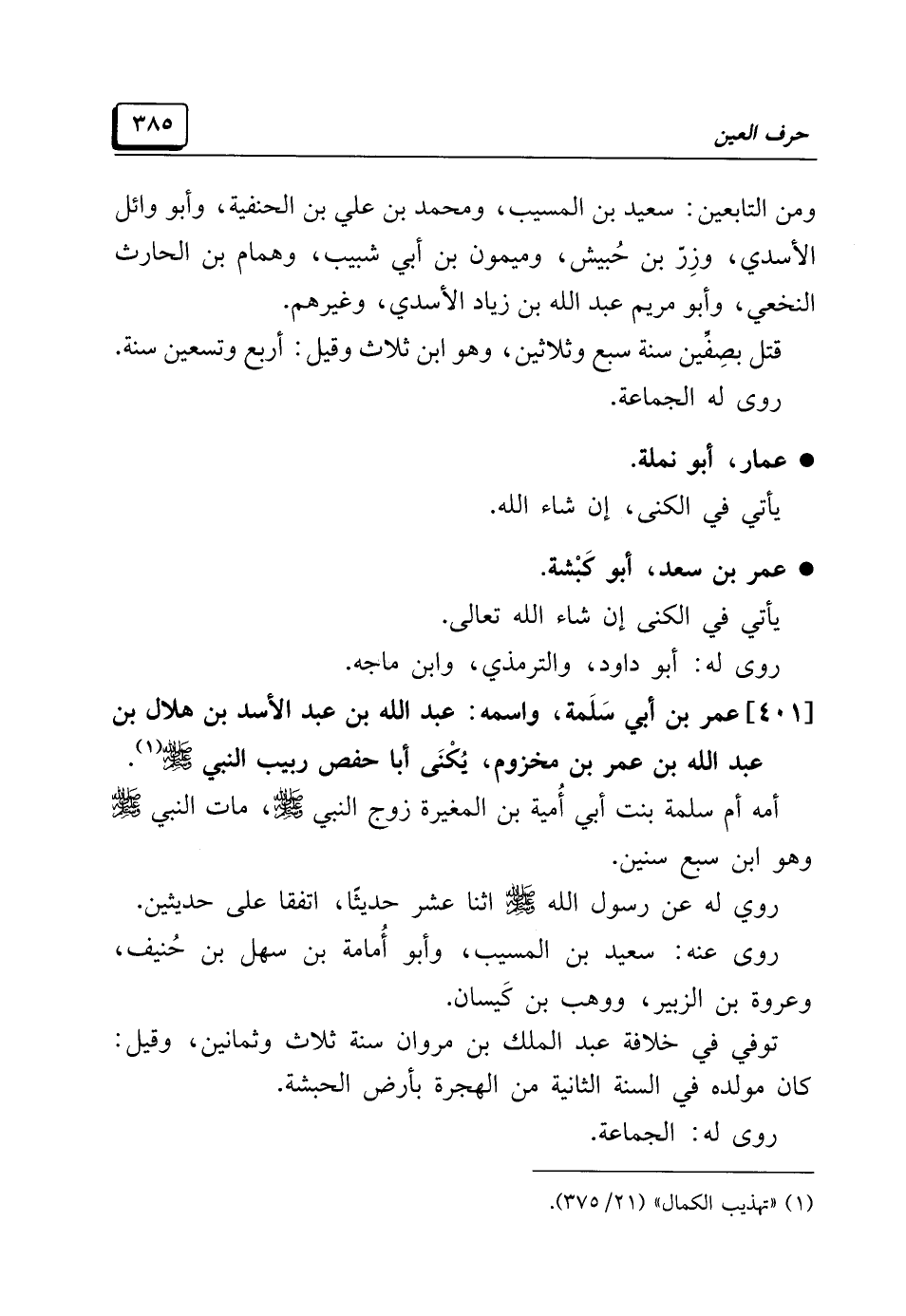 [٤٠١] عمر بن أبي سَلَمة، واسمه: عبد الله بن عبد الأسد بن هلال بن عبد الله بن عمر بن مخزوم، يُكْنَى أبا حفص ربيب النبي -صَلَّى اللهُ عَلَيْهِ وَسَلَّمَ- (¬١).