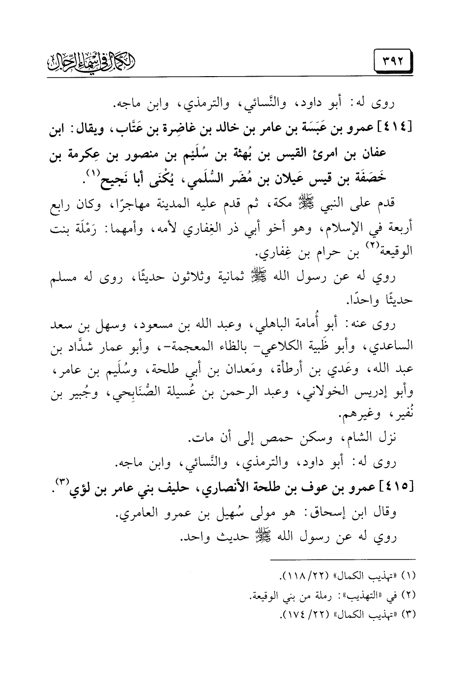 [٤١٤] عمرو بن عَبَسَة بن عامر بن خالد بن غاضِرة بن عَتَّاب، ويقال: ابن عفان بن امرئ القيس بن بُهثة بن سُلَيْم بن منصور بن عِكرمة بن خَصَفَة بن قيس عَيلان بن مُضَر السُّلَمي، يُكْنَى أبا نَجيح (¬١).
