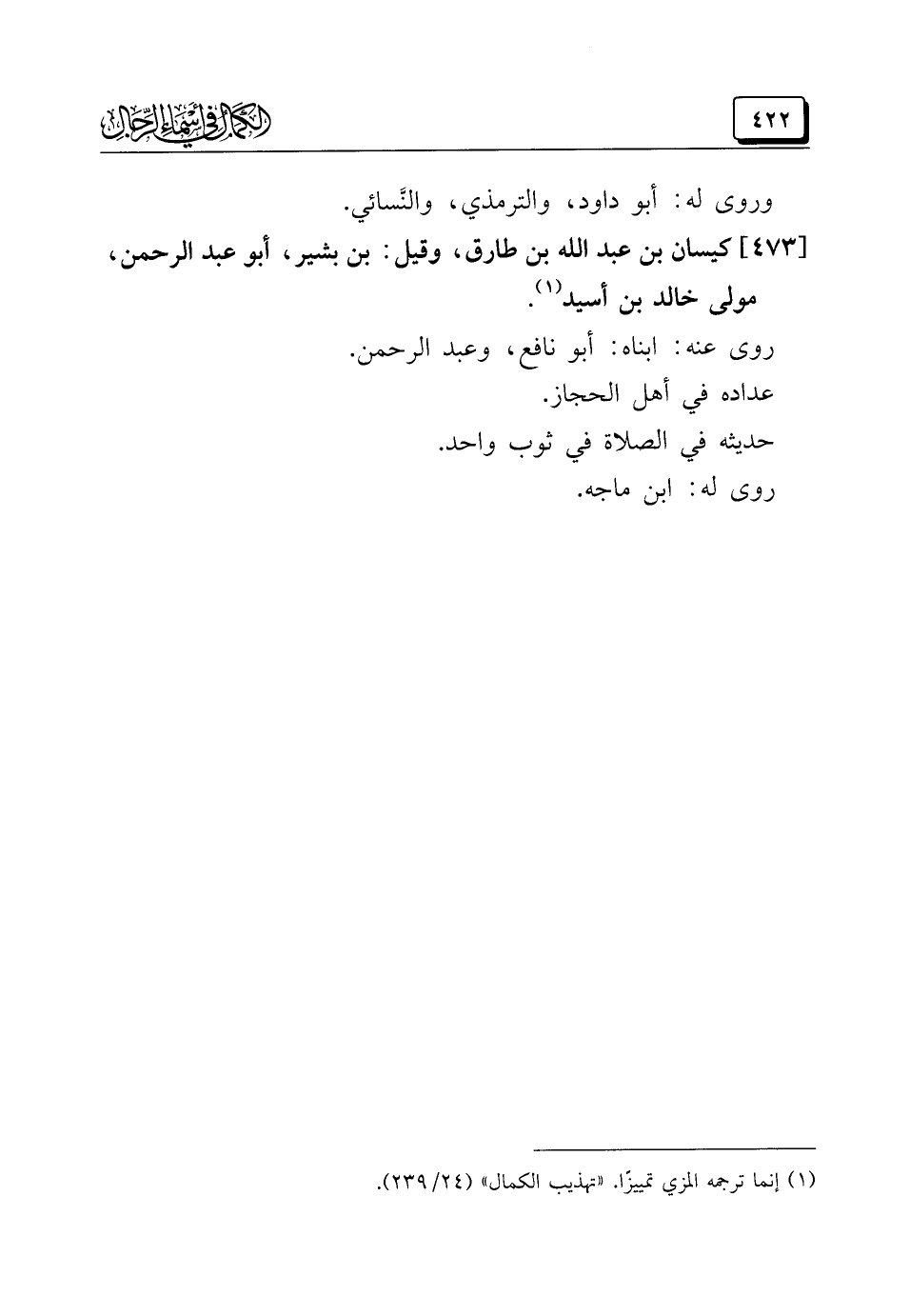 [٤٧٣] كيسان بن عبد الله بن طارق، وقيل: بن بشير، أبو عبد الرحمن، مولى خالد بن أسيد (¬١).