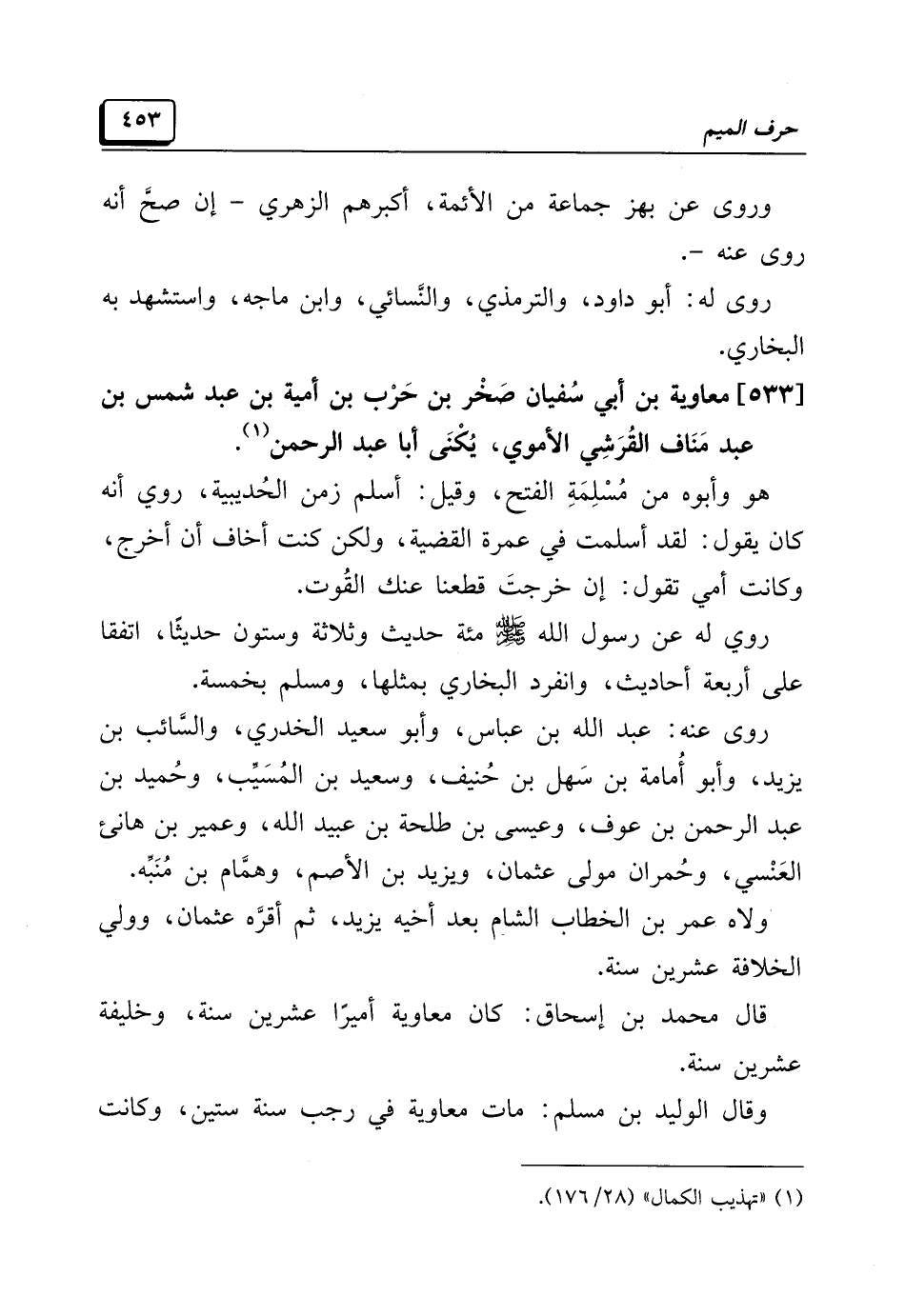 [٥٣٣] معاوية بن أبي سُفيان صَخْر بن حَرْب بن أمية بن عبد شمس بن عبد مَنَاف القُرَشِي الأموي، يُكْنَى أبا عبد الرحمن (¬١).