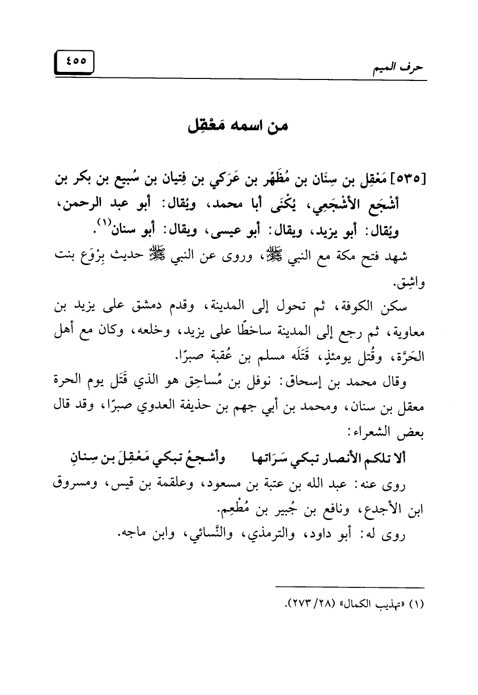 [٥٣٥] مَعْقِل بن سِنَان بن مُظَهِّر بن عَرَكي بن فِتيان بن سُبيع بن بكر بن أشْجَع الأشْجَعِي، يُكْنَى أبا محمد، ويُقال: أبو عبد الرحمن، ويُقال: أبو يزيد، ويقال: أبو عيسى، ويقال: أبو سنان (¬١).