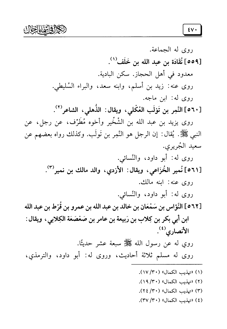 [٥٦٢] النَّوَّاس بن سَمْعَان بن خالد بن عبد الله بن عمرو بن قُرْط بن عبد الله ابن أبي بكر بن كِلاب بن رَبِيعَة بن عامر بن صَعْصَعَة الكِلَابِيّ، ويقال: الأَنْصَاريّ (¬٤).
