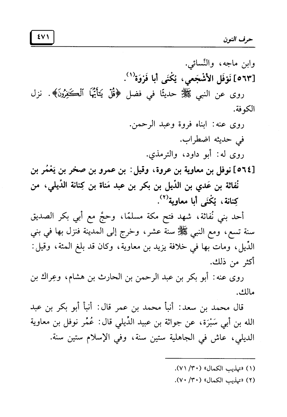 [٥٦٤] نوفل بن معاوية بن عُرْوَة، وقيل: بن عمرو بن صخر بن يَعْمُر بن نُفاثة بن عَدي بن الدِّيل بن بكر بن عبد مَناة بن كِنانة الدِّيلي، من كِنانة، يُكْنَى أبا معاوية (¬٢).