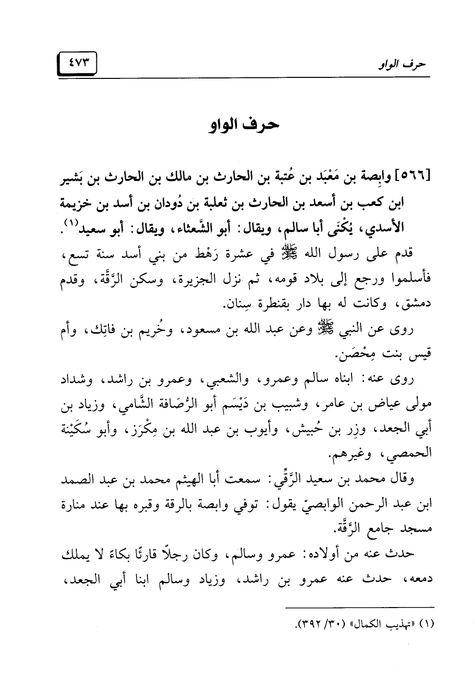 [٥٦٦] وابِصة بن مَعْبَد بن عُتبة بن الحارث بن مالك بن الحارث بن بَشير ابن كعب بن أسعد بن الحارث بن ثعلبة بن دُودان بن أسد بن خُزَيْمَة الأَسدِي، يُكْنَى أبا سالم، ويقال: أبو الشَّعثاء، ويقال: أبو سعيد (¬١).