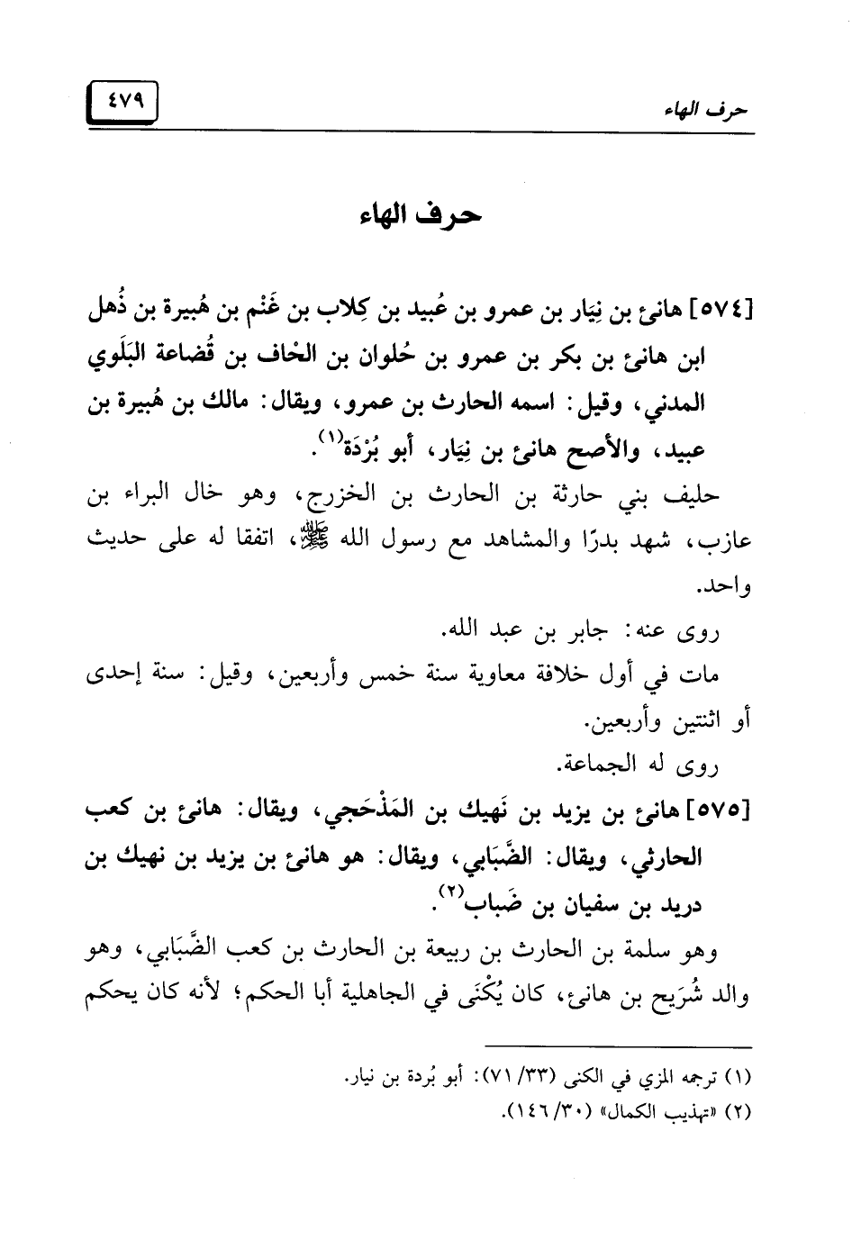 [٥٧٤] هانئ بن نِيَار بن عمرو بن عُبيد بن كِلاب بن غَنْم بن هُبَيْرَة بن ذُهل ابن هانئ بن بكر بن عمرو بن حُلوان بن الحاف بن قُضاعة البَلَوي المَدَني، وقيل: اسمه الحارث بن عمرو، ويقال: مالك بن هُبَيْرَة بن عبيد، والأصح هانئ بن نِيَار، أبو بُرْدَة (¬١).