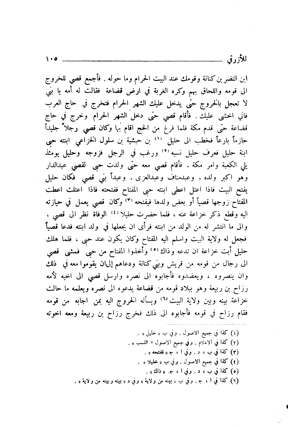 بْنِ النَّضْرِ بْنِ كِنَانَةَ، وَقَوْمُكَ عِنْدَ الْبَيْتِ الْحَرَامِ وَمَا حَوْلَهُ. فَأَجْمَعَ قُصَيٌّ لِلْخُرُوجِ إِلَى قَوْمِهِ وَاللِّحَاقِ بِهِمْ، وَكَرِهَ الْغُرْبَةَ فِي أَرْضِ قُضَاعَةَ، فَقَالَتْ لَهُ أُمُّهُ: يَا بُنَيَّ، لَا تَعْجَلْ بِالْخُرُوجِ حَتَّى يَدْخُلَ عَلَيْكَ الشَّهْرُ الْحَرَامُ، فَتَخْرُجَ فِي حَاجِّ الْعَرَبِ؛ فَإِنِّي أَخْشَى عَلَيْكَ. فَأَقَامَ قُصَيٌّ حَتَّى دَخَلَ الشَّهْرُ الْحَرَامُ، وَخَرَجَ فِي حَاجِّ قُضَاعَةَ حَتَّى قَدِمَ مَكَّةَ، فَلَمَّا فَرَغَ مِنَ الْحَجِّ أَقَامَ بِهَا، وَكَانَ قُصَيٌّ رَجُلًا جَلِيدًا حَازِمًا بَارِعًا، فَخَطَبَ إِلَى حَلِيلِ بْنِ حَبَشِيَّةَ بْنِ سَلُولَ الْخُزَاعِيِّ ابْنَتَهُ حُبَّى ابْنَةَ حَلِيلٍ، فَعَرَفَ حَلِيلٌ نَسَبَهُ، وَرَغِبَ فِي الرَّجُلِ، فَزَوَّجَهُ، وَحَلِيلٌ يَوْمَئِذٍ يَلِي الْكَعْبَةَ وَأَمْرَ مَكَّةَ، فَأَقَامَ قُصَيٌّ مَعَهُ حَتَّى وَلَدَتْ حُبَّى لِقُصَيٍّ عَبْدَ الدَّارِ، وَهُوَ أَكْبَرُ وَلَدِهِ، وَعَبْدَ مَنَافٍ، وَعَبْدَ الْعُزَّى، وَعَبْدًا بَنِي قُصَيٍّ، فَكَانَ حَلِيلٌ يَفْتَحُ الْبَيْتَ، فَإِذَا اعْتَلَّ أَعْطَى ابْنَتَهُ حُبَّى الْمِفْتَاحَ فَفَتَحَتْهُ، فَإِذَا اعْتَلَّتْ أَعْطَتِ الْمِفْتَاحَ زَوْجَهَا قُصَيًّا أَوْ بَعْضَ وَلَدِهَا فَيَفْتَحُهُ، وَكَانَ قُصَيٌّ يَعْمَلُ فِي حِيَازَتِهِ إِلَيْهِ، وَقَطَعَ ذِكْرَ خُزَاعَةَ عَنْهُ، فَلَمَّا حَضَرَتْ حَلِيلًا الْوَفَاةُ نَظَرَ إِلَى قُصَيٍّ، وَإِلَى مَا انْتَشَرَ لَهُ مِنَ الْوَلَدِ مِنَ ابْنَتَهِ، فَرَأَى أَنْ يَجْعَلَهَا فِي وَلَدِ ابْنَتِهِ، فَدَعَا قُصَيًّا، فَجَعَلَ لَهُ وِلَايَةَ الْبَيْتِ، وَأَسْلَمَ إِلَيْهِ الْمِفْتَاحَ، وَكَانَ يَكُونُ عِنْدَ حُبَّى، فَلَمَّا هَلَكَ حَلِيلٌ أَبَتْ خُزَاعَةُ أَنْ تَدَعَهُ وَذَاكَ، وَأَخَذُوا الْمِفْتَاحَ مِنْ حُبَّى، فَمَشَى قُصَيٌّ إِلَى رِجَالٍ مِنْ قَوْمِهِ مِنْ قُرَيْشٍ وَبَنِي كِنَانَةَ، وَدَعَاهُمْ إِلَى أَنْ يَقُومُوا مَعَهُ فِي ذَلِكَ وَأَنْ يَنْصُرُوهُ وَيُعَضِّدُوهُ، فَأَجَابُوهُ إِلَى نَصْرِهِ، وَأَرْسَلَ قُصَيٌّ إِلَى أَخِيهِ لِأُمِّهِ رَزَاحِ بْنِ رَبِيعَةَ وَهُوَ بِبِلَادِ قَوْمِهِ مِنْ قُضَاعَةَ، يَدْعُوهُ إِلَى نَصْرِهِ، وَيُعْلِمُهُ مَا حَالَتْ خُزَاعَةُ بَيْنَهُ وَبَيْنَ وِلَايَةِ الْبَيْتِ، وَيَسْأَلُهُ الْخُرُوجَ إِلَيْهِ بِمَنْ أَجَابَهُ مِنْ قَوْمِهِ، فَقَامَ رَزَاحٌ فِي قَوْمِهِ، فَأَجَابُوهُ إِلَى ذَلِكَ، فَخَرَجَ رَزَاحُ بْنُ رَبِيعَةَ وَمَعَهُ إِخْوَتُهُ