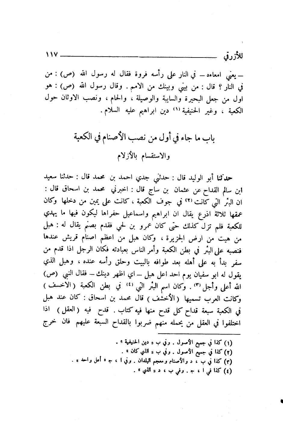 حَدَّثَنَا أَبُو الْوَلِيدِ قَالَ: حَدَّثَنِي جَدِّي أَحْمَدُ بْنُ مُحَمَّدٍ قَالَ: حَدَّثَنَا سَعِيدُ بْنُ مُحَمَّدٍ قَالَ: حَدَّثَنَا سَعِيدُ بْنُ سَالِمٍ الْقَدَّاحُ، عَنْ عُثْمَانَ بْنِ سَاجٍ، قَالَ: أَخْبَرَنِي مُحَمَّدُ بْنُ إِسْحَاقَ، قَالَ: «إِنَّ الْبِئْرَ الَّتِي كَانَتْ فِي جَوْفِ الْكَعْبَةِ، كَانَتْ عَلَى يَمِينِ مَنْ دَخَلَهَا، وَكَانَ عُمْقُهَا ثَلَاثَةَ أَذْرُعٍ، يُقَالُ إِنَّ إِبْرَاهِيمَ وَإِسْمَاعِيلَ حَفَرَاهَا؛ لِيَكُونَ فِيهَا مَا يُهْدَى لِلْكَعْبَةِ، فَلَمْ تَزَلْ كَذَلِكَ حَتَّى كَانَ عَمْرُو بْنُ لُحَيٍّ، فَقَدِمَ بِصَنَمٍ يُقَالُ لَهُ هُبَلُ مِنْ هِيتَ مِنْ أَرْضِ الْجَزِيرَةِ، وَكَانَ هُبَلُ مِنْ أَعْظَمِ أَصْنَامِ قُرَيْشٍ عِنْدَهَا، فَنَصَبَهُ عَلَى الْبِئْرِ فِي بَطْنِ الْكَعْبَةِ، وَأَمَرَ النَّاسَ بِعِبَادَتِهِ، فَكَانَ الرَّجُلُ إِذَا قَدِمَ مِنْ سَفَرٍ بَدَأَ بِهِ عَلَى أَهْلِهِ بَعْدَ طَوَافِهِ بِالْبَيْتِ، وَحَلَقَ رَأْسَهُ عِنْدَهُ» وَهُبَلُ الَّذِي يَقُولُ لَهُ أَبُو سُفْيَانَ يَوْمَ أُحُدٍ: اعْلُ هُبَلُ. أَيْ: أَظْهِرْ دِينَكَ. فَقَالَ النَّبِيُّ صَلَّى اللهُ عَلَيْهِ وَسَلَّمَ: «§اللَّهُ أَعْلَى وَأَجَلُّ» . وَكَانَ اسْمُ الْبِئْرِ الَّتِي فِي بَطْنِ الْكَعْبَةِ الْأَخْسَفَ، وَكَانَتِ الْعَرَبُ تُسَمِّيهَا الْأَخْشَفَ " قَالَ مُحَمَّدُ بْنُ إِسْحَاقَ: كَانَ عِنْدَ هُبَلَ فِي الْكَعْبَةِ سَبْعَةُ قِدَاحٍ، كُلُّ قَدَحٍ مِنْهَا فِيهِ كِتَابٌ، قَدَحٌ فِيهِ الْعَقْلُ، إِذَا اخْتَلَفُوا فِي الْعَقْلِ مَنْ يَحْمِلُهُ مِنْهُمْ ضَرَبُوا بِالْقِدَاحِ السَّبْعَةِ عَلَيْهِمْ، فَإِنْ خَرَجَ