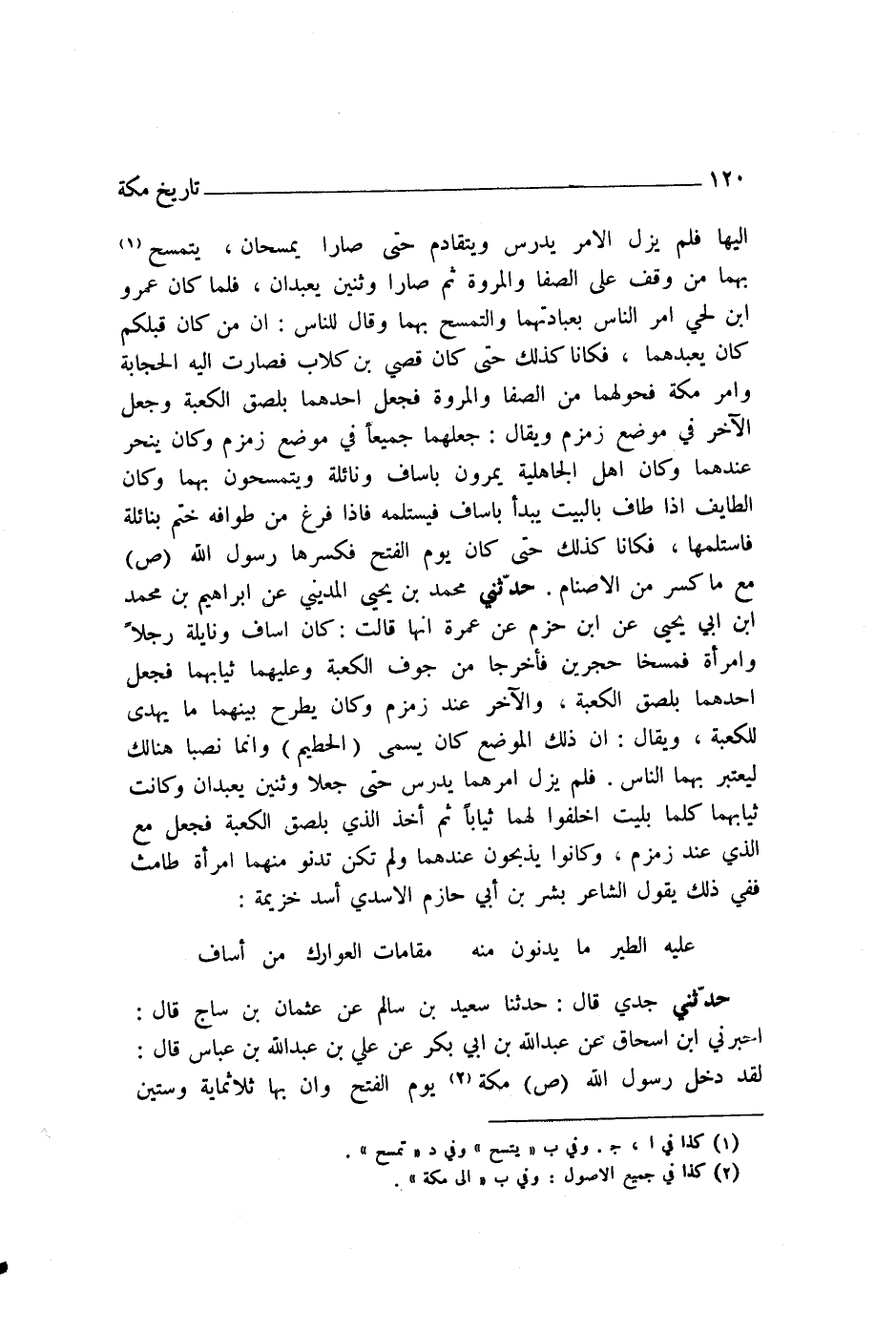 إِلَيْهَا، فَلَمْ يَزَلِ الْأَمْرُ يَدْرُسُ وَيَتَقَادَمُ حَتَّى صَارَا يُمْسَحَانِ، يَتَمَسَّحُ بِهِمَا مَنْ وَقَفَ عَلَى الصَّفَا وَالْمَرْوَةِ، ثُمَّ صَارَا وَثَنَيْنِ يُعْبَدَانِ، فَلَمَّا كَانَ عَمْرُو بْنُ لُحَيٍّ أَمَرَ النَّاسَ بِعِبَادَتِهِمَا وَالتَّمَسُّحِ بِهِمَا، وَقَالَ لِلنَّاسِ: إِنَّ مَنْ كَانَ قَبْلَكُمْ كَانَ يَعْبُدُهُمَا. فَكَانَا كَذَلِكَ حَتَّى كَانَ قُصَيُّ بْنُ كِلَابٍ، فَصَارَتْ إِلَيْهِ الْحِجَابَةُ وَأَمْرُ مَكَّةَ، فَحَوَّلَهُمَا مِنَ الصَّفَا وَالْمَرْوَةِ، فَجَعَلَ أَحَدَهُمَا بِلَصْقِ الْكَعْبَةِ، وَجَعَلَ الْآخَرَ فِي مَوْضِعِ زَمْزَمَ. وَيُقَالُ: جَعَلَهُمَا جَمِيعًا فِي مَوْضِعِ زَمْزَمَ، وَكَانَ يَنْحَرُ عِنْدَهُمَا، وَكَانَ أَهْلُ الْجَاهِلِيَّةِ يَمُرُّونَ بِإِسَافٍ وَنَائِلَةَ وَيَتَمَسَّحُونَ بِهِمَا، وَكَانَ الطَّائِفُ إِذَا طَافَ بِالْبَيْتِ يَبْدَأُ بِإِسَافٍ فَيَسْتَلِمُهُ، فَإِذَا فَرَغَ مِنْ طَوَافِهِ خَتَمَ بِنَائِلَةَ فَاسْتَلَمَهَا، فَكَانَا كَذَلِكَ حَتَّى كَانَ يَوْمُ الْفَتْحِ، فَكَسَرَهَا رَسُولُ اللَّهِ صَلَّى اللهُ عَلَيْهِ وَسَلَّمَ مَعَ مَا كُسِرَ مِنَ الْأَصْنَامِ "