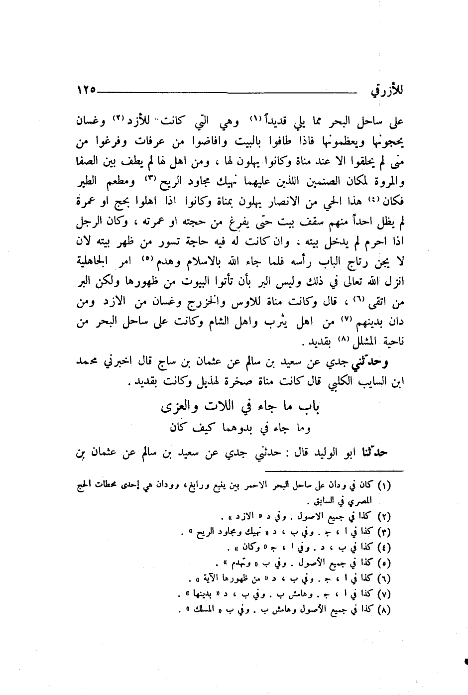 وَحَدَّثَنِي جَدِّي، عَنْ سَعِيدِ بْنِ سَالِمٍ، عَنْ عُثْمَانَ بْنِ سَاجٍ، قَالَ: أَخْبَرَنِي مُحَمَّدُ بْنُ السَّائِبِ الْكَلْبِيُّ، قَالَ: «§كَانَتْ مَنَاةُ صَخْرَةً لِهُذَيْلٍ، وَكَانَتْ بِقُدَيْدٍ»