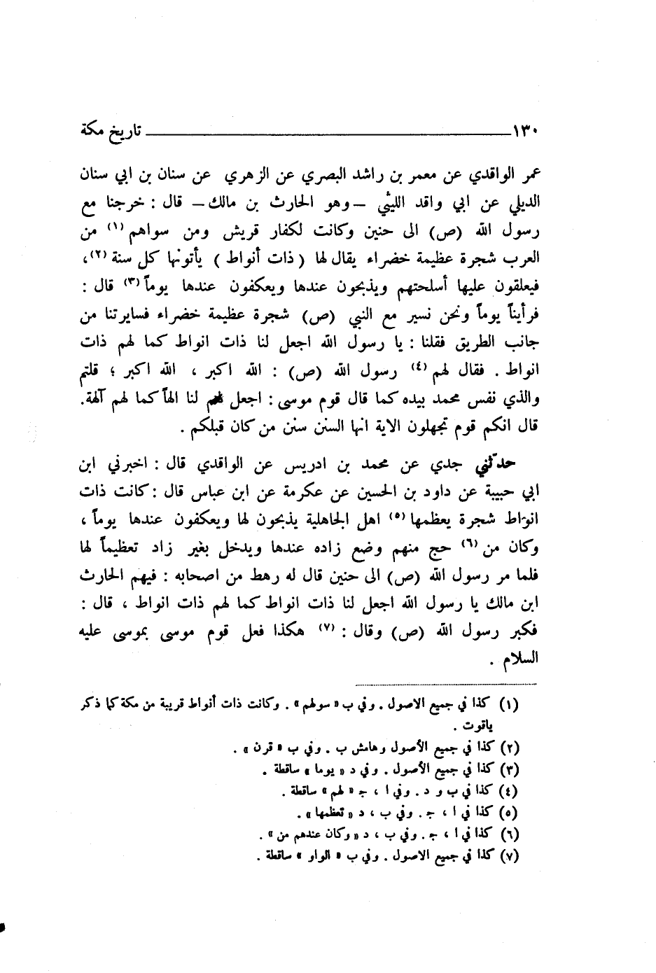 حَدَّثَنِي جَدِّي، عَنْ مُحَمَّدِ بْنِ إِدْرِيسَ، عَنِ الْوَاقِدِيِّ، قَالَ: أَخْبَرَنِي ابْنُ أَبِي حَبِيبَةَ، عَنْ دَاوُدَ بْنِ الْحُصَيْنِ، عَنْ عِكْرِمَةَ، عَنِ ابْنِ عَبَّاسٍ، قَالَ: كَانَتْ ذَاتُ أَنْوَاطٍ شَجَرَةً يُعَظِّمُهَا أَهْلُ الْجَاهِلِيَّةِ، يَذْبَحُونَ لَهَا، وَيَعْكُفُونَ عِنْدَهَا يَوْمًا، وَكَانَ مَنْ حَجَّ مِنْهُمْ وَضَعَ زَادَهُ عِنْدَهَا وَيَدْخُلُ بِغَيْرِ زَادٍ؛ تَعْظِيمًا لَهَا، فَلَمَّا مَرَّ رَسُولُ اللَّهِ صَلَّى اللهُ عَلَيْهِ وَسَلَّمَ إِلَى حُنَيْنٍ قَالَ لَهُ رَهْطٌ مِنْ أَصْحَابِهِ فِيهِمُ الْحَارِثُ بْنُ مَالِكٍ: يَا رَسُولَ اللَّهِ، §اجْعَلْ لَنَا ذَاتَ أَنْوَاطٍ كَمَا لَهُمْ ذَاتُ أَنْوَاطٍ. قَالَ: فَكَبَّرَ رَسُولُ اللَّهِ صَلَّى اللهُ عَلَيْهِ وَسَلَّمَ، وَقَالَ: «هَكَذَا فَعَلَ قَوْمُ مُوسَى بِمُوسَى عَلَيْهِ السَّلَامُ»