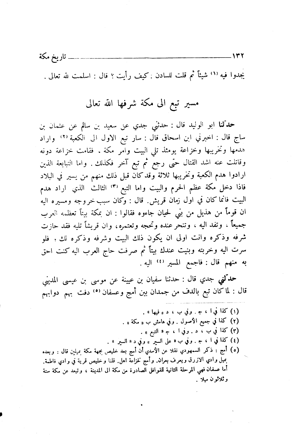 حَدَّثَنِي جَدِّي، قَالَ: حَدَّثَنَا سُفْيَانُ بْنُ عُيَيْنَةَ، عَنْ مُوسَى بْنِ عِيسَى الْمَدِينِيِّ، قَالَ: " §لَمَّا كَانَ تُبَّعٌ بِالدُّفِّ مِنْ جُمْدَانَ بَيْنَ أَمَجَ وَعُسْفَانَ، دَفَّتْ بِهِمْ دَوَابُّهُمْ