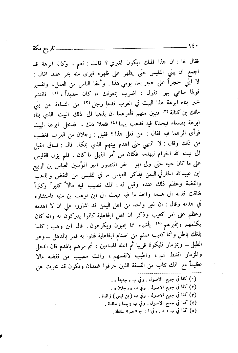 فَقَالَ لَهَا: إِنَّ هَذَا الْمُلْكَ أَيَكُونُ لِغَيْرِي؟ قَالَتْ: نَعَمْ. وَكَانَ أَبْرَهَةُ قَدْ أَجْمَعَ أَنْ يَبْنِيَ الْقُلَّيْسَ حَتَّى يَظْهَرَ عَلَى ظَهْرِهِ، فَيَرَى مِنْهُ بَحْرَ عَدَنَ، فَقَالَ: لَا أَبْنِي حَجَرًا عَلَى حَجَرٍ بَعْدَ يَوْمِي هَذَا. وَأَعْفَى النَّاسَ مِنَ الْعَمَلِ. وَتَفْسِيرُ قَوْلِهَا: سَاعِي بُهْرٍ، تَقُولُ: اضْرِبْ بِمِعْوَلِكَ مَا كَانَ حَدِيدًا. فَانْتَشَرَ خَبَرُ بِنَاءِ أَبْرَهَةَ هَذَا الْبَيْتَ فِي الْعَرَبِ، فَدَعَا رَجُلٌ مِنَ النَّسَاءَةِ مِنْ بَنِي مَالِكِ بْنِ كِنَانَةَ، فَتَبَيَّنَ مِنْهُمْ، فَأَمَرَهُمَا أَنْ يَذْهَبَا إِلَى ذَلِكَ الْبَيْتِ الَّذِي بَنَاهُ أَبْرَهَةُ بِصَنْعَاءَ، فَيُحْدِثَا فِيهِ، فَذَهَبَ بِهِمَا فَفَعَلَا ذَلِكَ، فَدَخَلَ أَبْرَهَةُ الْبَيْتَ، فَرَأَى أَثَرَهُمَا فِيهِ، فَقَالَ: مَنْ فَعَلَ هَذَا؟ فَقِيلَ: رَجُلَانِ مِنَ الْعَرَبِ. فَغَضِبَ مِنْ ذَلِكَ، وَقَالَ: لَا أَنْتَهِي حَتَّى أَهْدِمَ بَيْتَهُمُ الَّذِي بِمَكَّةَ. قَالَ: فَسَاقَ الْفِيلَ إِلَى بَيْتِ اللَّهِ الْحَرَامِ لِيَهْدِمَهُ، فَكَانَ مِنْ أَمْرِ الْفِيلِ مَا كَانَ، فَلَمْ يَزَلِ الْقُلَّيْسُ عَلَى مَا كَانَ عَلَيْهِ، حَتَّى وَلَّى أَبُو جَعْفَرٍ الْمَنْصُورُ أَمِيرُ الْمُؤْمِنِينَ الْعَبَّاسَ بْنَ الرَّبِيعِ بْنِ عُبَيْدِ اللَّهِ الْحَارِثِيَّ الْيَمَنَ، فَذَكَرَ الْعَبَّاسُ مَا فِي الْقُلَّيْسِ مِنَ النَّقْضِ وَالذَّهَبِ وَالْفِضَّةِ، وَعَظَّمَ ذَلِكَ عِنْدَهُ، وَقِيلَ لَهُ: إِنَّكَ تُصِيبُ فِيهِ مَالًا كَثِيرًا وَكَنْزًا. فَتَاقَتْ نَفْسُهُ إِلَى هَدْمِهِ وَأَخْذِ مَا فِيهِ، فَبَعَثَ إِلَى ابْنٍ لِوَهْبِ بْنِ مُنَبِّهٍ، فَاسْتَشَارَهُ فِي هَدْمِهِ، وَقَالَ: إِنَّ غَيْرَ وَاحِدٍ مِنْ أَهْلِ الْيَمَنِ قَدْ أَشَارُوا عَلَيَّ أَنْ لَا أَهْدِمَهُ، وَعَظَّمَ عَلَيَّ أَمْرَ كُعَيْبٍ، وَذَكَرَ أَنَّ أَهْلَ الْجَاهِلِيَّةِ كَانُوا يَتَبَرَّكُونَ بِهِ، وَأَنَّهُ كَانَ يُكَلِّمُهُمْ وَيُخْبِرُهُمْ بِأَشْيَاءَ مِمَّا يُحِبُّونَ وَيَكْرَهُونَ. قَالَ ابْنُ وَهْبٍ: كُلُّ مَا بَلَغَكَ بَاطِلٌ، وَإِنَّمَا كُعَيْبٌ صَنَمٌ مِنْ أَصْنَامِ الْجَاهِلِيَّةِ فُتِنُوا بِهِ، فَمُرْ بِالدَّهْلِ - وَهُوَ الطَّبْلُ - وَبِمِزْمَارٍ، فَلْيَكُونَا قَرِيبًا، ثُمَّ أَعْلِهِ الْهَدَّامِينَ، ثُمَّ مُرْهُمْ بِالْهَدْمِ، فَإِنَّ الدَّهْلَ وَالْمِزْمَارَ أَنْشَطُ لَهُمْ، وَأَطْيَبُ لِأَنْفُسِهِمْ، وَأَنْتَ مُصِيبٌ مِنْ نَقْضِهِ مَالًا عَظِيمًا، مَعَ أَنَّكَ تُثَابُ مِنَ الْفَسَقَةِ الَّذِينَ حَرَقُوا غُمْدَانَ، وَتَكُونُ قَدْ مَحَوْتَ عَنْ