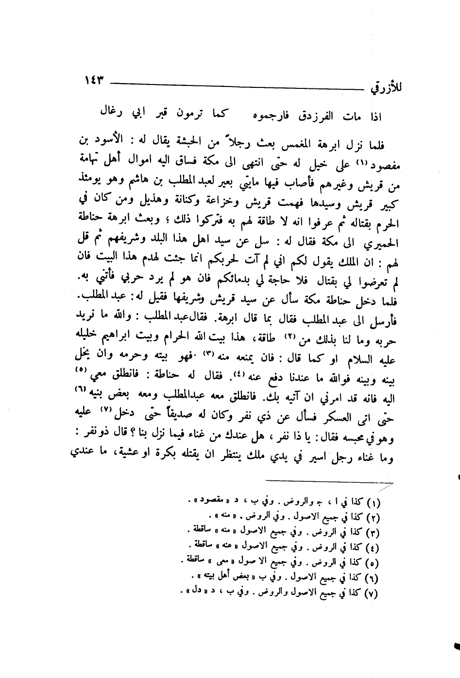 فَلَمَّا نَزَلَ أَبْرَهَةُ الْمُغَمَّسَ بَعَثَ رَجُلًا مِنَ الْحَبَشَةِ يُقَالُ لَهُ الْأَسْوَدُ بْنُ مَفْصُودٍ عَلَى خَيْلٍ لَهُ، حَتَّى انْتَهَى إِلَى مَكَّةَ، فَسَاقَ إِلَيْهِ أَمْوَالَ أَهْلِ تِهَامَةَ مِنْ قُرَيْشٍ وَغَيْرِهِمْ، فَأَصَابَ فِيهَا مِائَتَيْ بَعِيرٍ لِعَبْدِ الْمُطَّلِبِ بْنِ هَاشِمٍ، وَهُوَ يَوْمَئِذٍ كَبِيرُ قُرَيْشٍ وَسَيِّدُهَا، فَهَمَّتْ قُرَيْشٌ وَخُزَاعَةُ وَكِنَانَةُ وَهُذَيْلٌ وَمَنْ كَانَ فِي الْحَرَمِ بِقِتَالِهِ، ثُمَّ عَرَفُوا أَنَّهُ لَا طَاقَةَ لَهُمْ بِهِ، فَتَرَكُوا ذَلِكَ، وَبَعَثَ أَبْرَهَةُ حِنَاطَةَ الْحِمْيَرِيَّ إِلَى مَكَّةَ، فَقَالَ لَهُ: سَلْ عَنْ سَيِّدِ أَهْلِ هَذَا الْبَلَدِ وَشَرِيفِهِمْ، ثُمَّ قُلْ لَهُمْ: إِنَّ الْمَلِكَ يَقُولُ لَكُمْ: إِنِّي لَمْ آتِ لِحَرْبِكُمْ، إِنَّمَا جِئْتُ لِهَدْمِ هَذَا الْبَيْتِ، فَإِنْ لَمْ تَعْرِضُوا لِي بِقِتَالٍ فَلَا حَاجَةَ لِي بِدِمَائِكُمْ، فَإِنْ هُوَ لَمْ يُرِدْ حَرْبِي فَأْتِنِي بِهِ. فَلَمَّا دَخَلَ حِنَاطَةُ مَكَّةَ سَأَلَ عَنْ سَيِّدِ قُرَيْشٍ وَشَرِيفِهَا، فَقِيلَ لَهُ: عَبْدُ الْمُطَّلِبِ. فَأَرْسَلَ إِلَى عَبْدِ الْمُطَّلِبِ، فَقَالَ بِمَا قَالَ أَبْرَهَةُ، فَقَالَ عَبْدُ الْمُطَّلِبِ: وَاللَّهِ مَا نُرِيدُ حَرْبَهُ، وَمَا لَنَا بِذَلِكَ مِنْ طَاقَةٍ، هَذَا بَيْتُ اللَّهِ الْحَرَامُ، وَبَيْتُ إِبْرَاهِيمَ خَلِيلِهِ عَلَيْهِ السَّلَامُ - أَوْ كَمَا قَالَ - فَإِنْ يَمْنَعْهُ مِنْهُ فَهُوَ بَيْتُهُ وَحَرَمُهُ، وَإِنْ يُخَلِّ بَيْنَهُ وَبَيْنَهُ فَوَاللَّهِ مَا عِنْدَنَا دَفْعٌ عَنْهُ. فَقَالَ لَهُ حِنَاطَةُ: فَانْطَلِقْ مَعِي إِلَيْهِ، فَإِنَّهُ قَدْ أَمَرَنِي أَنْ آتِيَهُ بِكَ. فَانْطَلَقَ مَعَهُ عَبْدُ الْمُطَّلِبِ وَمَعَهُ بَعْضُ بَنِيهِ، حَتَّى أَتَى الْعَسْكَرَ، فَسَأَلَ عَنْ ذِي نَفْرٍ، وَكَانَ لَهُ صَدِيقًا، حَتَّى دَخَلَ عَلَيْهِ وَهُوَ فِي مَحْبَسِهِ، فَقَالَ: يَا ذَا نَفْرٍ، هَلْ عِنْدَكَ مِنْ غَنَاءٍ فِيمَا نَزَلَ بِنَا؟ قَالَ ذُو نَفْرٍ: وَمَا غَنَاءُ رَجُلٍ أَسِيرٍ فِي يَدَيْ مَلِكٍ يَنْتَظِرُ أَنْ يَقْتُلَهُ بُكْرَةً أَوْ عَشِيَّةً؟ مَا عِنْدِي