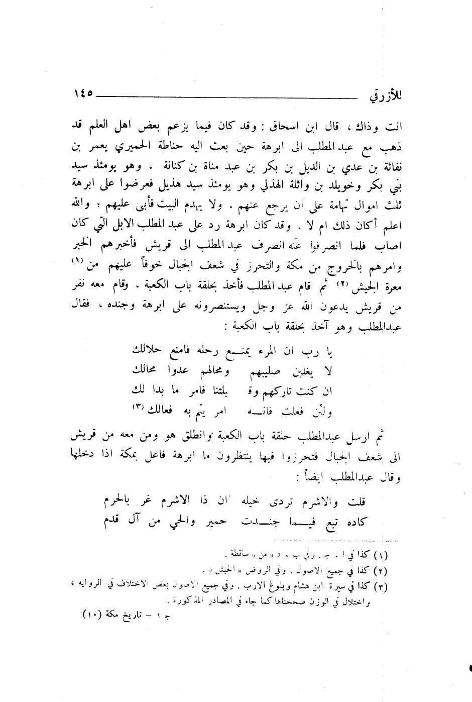 : أَنْتَ وَذَاكَ. قَالَ ابْنُ إِسْحَاقَ: وَقَدْ كَانَ فِيمَا يَزْعُمُ بَعْضُ أَهْلِ الْعِلْمِ قَدْ ذَهَبَ مَعَ عَبْدِ الْمُطَّلِبِ إِلَى أَبْرَهَةَ حِينَ بَعَثَ إِلَيْهِ حِنَاطَةَ الْحِمْيَرِيَّ يَعْمَرُ بْنُ نُفَاثَةَ بْنِ عَدِيِّ بْنِ الدِّيلِ بْنِ بَكْرِ بْنِ عَبْدِ مَنَاةَ بْنِ كِنَانَةَ، وَهُوَ يَوْمَئِذٍ سَيِّدُ بَنِي بَكْرٍ، وَخُوَيْلِدُ بْنُ وَاثِلَةَ الْهُذَلِيُّ، وَهُوَ يَوْمَئِذٍ سَيِّدُ هُذَيْلٍ، فَعَرَضُوا عَلَى أَبْرَهَةَ ثُلُثَ أَمْوَالِ تِهَامَةَ عَلَى أَنْ يَرْجِعَ عَنْهُمْ وَلَا يَهْدِمَ الْبَيْتَ، فَأَبَى عَلَيْهِمْ، وَاللَّهُ أَعْلَمُ أَكَانَ ذَلِكَ أَمْ لَا. وَقَدْ كَانَ أَبْرَالأبل التى كَةُ رَدَّ عَلَى عَبْدِ الْمُطَّلِبِ كَانَ أَصَابَ، فَلَمَّا انْصَرَفُوا عَنْهُ انْصَرَفَ عَبْدُ الْمُطَّلِبِ إِلَى قُرَيْشٍ، فَأَخْبَرَهُمُ الْخَبَرَ، وَأَمَرَهُمْ بِالْخُرُوجِ مِنْ مَكَّةَ، وَالتَّحَرُّزِ فِي شَعَفِ الْجِبَالِ؛ خَوْفًا عَلَيْهِمْ مِنْ مَعَرَّةِ الْجَيْشِ، ثُمَّ قَامَ عَبْدُ الْمُطَّلِبِ، فَأَخَذَ بِحَلْقَةِ بَابِ الْكَعْبَةِ، وَقَامَ مَعَهُ نَفَرٌ مِنْ قُرَيْشٍ، يَدْعُونَ اللَّهَ عَزَّ وَجَلَّ وَيَسْتَنْصِرُونَهُ عَلَى أَبْرَهَةَ وَجُنْدِهِ، فَقَالَ عَبْدُ الْمُطَّلِبِ وَهُوَ آخِذٌ بِحَلْقَةِ بَابِ الْكَعْبَةِ: