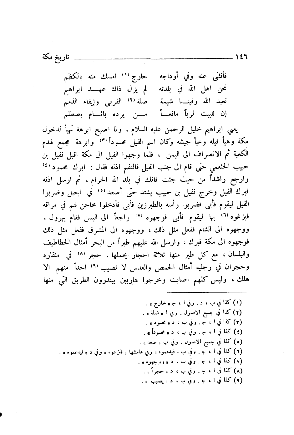 يَعْنِي إِبْرَاهِيمَ خَلِيلَ الرَّحْمَنِ عَلَيْهِ السَّلَامُ، وَلَمَّا أَصْبَحَ أَبْرَهَةُ تَهَيَّأَ لِدُخُولِ مَكَّةَ، وَهَيَّأَ فِيلَهُ، وَعَبَّأَ جَيْشَهُ، وَكَانَ اسْمُ الْفِيلِ مَحْمُودًا، وَأَبْرَهَةُ مُجْمِعٌ لِهَدْمِ الْكَعْبَةِ، ثُمَّ الِانْصِرَافِ إِلَى الْيَمَنِ، فَلَمَّا وَجَّهُوا الْفِيلَ إِلَى مَكَّةَ أَقْبَلَ نُفَيْلُ بْنُ حَبِيبٍ الْخَثْعَمِيُّ حَتَّى قَامَ إِلَى جَنْبِ الْفِيلِ، فَالْتَقَمَ أُذُنَهُ، فَقَالَ: ابْرُكْ مَحْمُودًا، وَارْجِعْ رَاشِدًا مِنْ حَيْثُ جِئْتَ، فَإِنَّكَ فِي بَلَدِ اللَّهِ الْحَرَامِ. ثُمَّ أَرْسَلَ أُذُنَهُ، فَبَرَكَ الْفِيلُ، وَخَرَجَ نُفَيْلُ بْنُ حَبِيبٍ يَشْتَدُّ حَتَّى أَصْعَدَ فِي الْجَبَلِ، وَضَرَبُوا الْفِيلَ لَيَقُومَ فَأَبَى، فَضَرَبُوا رَأْسَهُ بِالطَّبَرْزِينِ فَأَبَى، فَأَدْخَلُوا مَحَاجِنَ لَهُمْ فِي مَرَاقِّهِ فَبَزَغُوهُ بِهَا لَيَقُومَ فَأَبَى، فَوَجَّهُوهُ رَاجِعًا إِلَى الْيَمَنِ فَقَامَ يُهَرْوِلُ، وَوَجَّهُوهُ إِلَى الشَّامِ فَفَعَلَ مِثْلَ ذَلِكَ، وَوَجَّهُوهُ إِلَى الْمَشْرِقِ فَفَعَلَ مِثْلَ ذَلِكَ، فَوَجَّهُوهُ إِلَى مَكَّةَ فَبَرَكَ، وَأَرْسَلَ اللَّهُ عَلَيْهِمْ طَيْرًا مِنَ الْبَحْرِ أَمْثَالَ الْخَطَاطِيفِ وَالْبِلْسَانِ، مَعَ كُلِّ طَيْرٍ مِنْهَا ثَلَاثَةُ أَحْجَارٍ يَحْمِلُهَا، حَجَرٌ فِي مِنْقَارِهِ، وَحَجَرَانِ فِي رِجْلَيْهِ أَمْثَالُ الْحِمَّصِ وَالْعَدَسِ، لَا تُصِيبُ أَحَدًا مِنْهُمْ إِلَّا هَلَكَ، وَلَيْسَ كُلَّهُمْ أَصَابَتْ، وَخَرَجُوا هَارِبِينَ يَبْتَدِرُونَ الطَّرِيقَ الَّتِي مِنْهَا