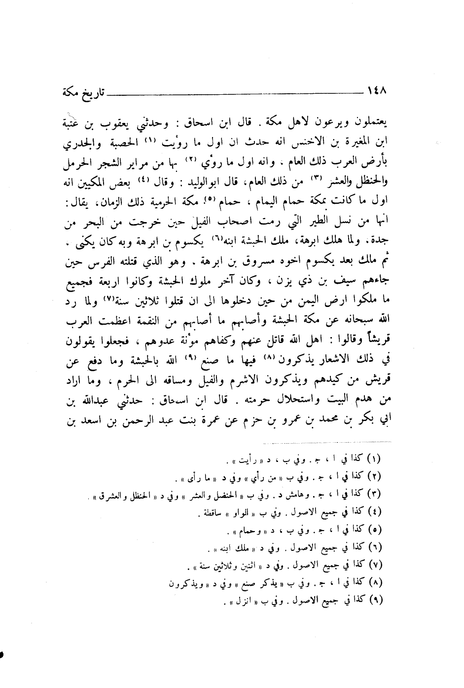 يَعْتَمِلُونَ وَيَرْعَوْنَ لِأَهْلِ مَكَّةَ. قَالَ ابْنُ إِسْحَاقَ: وَحَدَّثَنِي يَعْقُوبُ بْنُ عُتْبَةَ بْنِ الْمُغِيرَةِ بْنِ الْأَخْنَسِ أَنَّهُ حُدِّثَ أَنَّ أَوَّلَ مَا رُؤِيَتِ الْحَصْبَةُ وَالْجُدَرِيُّ بِأَرْضِ الْعَرَبِ ذَلِكَ الْعَامَ، وَأَنَّهُ أَوَّلُ مَا رُؤِيَ بِهَا مِنْ مَرَايِرِ الشَّجَرِ الْحَرْمَلِ وَالْحَنْظَلُ وَالْعُشْرُ مِنْ ذَلِكَ الْعَامِ " قَالَ أَبُو الْوَلِيدِ: وَقَالَ بَعْضُ الْمَكِّيِّينَ: إِنَّهُ أَوَّلُ مَا كَانَتْ بِمَكَّةَ حَمَامُ الْيَمَامِ، حَمَامُ مَكَّةَ الْحَرَمِيَّةِ ذَلِكَ الزَّمَانَ. يُقَالُ: إِنَّهَا مِنْ نَسْلِ الطَّيْرِ الَّتِي رَمَتْ أَصْحَابَ الْفِيلِ حِينَ خَرَجَتْ مِنَ الْبَحْرِ مِنْ جُدَّةَ، وَلَمَّا هَلَكَ أَبْرَهَةُ مَلَكَ الْحَبَشَةَ ابْنُهُ يَكْسُومُ بْنُ أَبْرَهَةَ، وَبِهِ كَانَ يُكْنَى، ثُمَّ مَلَكَ بَعْدَ يَكْسُومَ أَخُوهُ مَسْرُوقُ بْنُ أَبْرَهَةَ، وَهُوَ الَّذِي قَتَلَتْهُ الْفُرْسُ حِينَ جَاءَهُمْ سَيْفُ بْنُ ذِي يَزَنَ، وَكَانَ آخِرَ مُلُوكِ الْحَبَشَةِ، وَكَانُوا أَرْبَعَةً، فَجَمِيعُ مَا مَلَكُوا أَرْضَ الْيَمَنِ مِنْ حِينِ دَخَلُوهَا إِلَى أَنْ قُتِلُوا ثَلَاثِينَ سَنَةً، وَلَمَّا رَدَّ اللَّهُ سُبْحَانَهُ عَنْ مَكَّةَ الْحَبَشَةَ، وَأَصَابَهُمْ مَا أَصَابَهُمْ مِنَ النِّقْمَةِ، أَعْظَمَتِ الْعَرَبُ قُرَيْشًا، وَقَالُوا: أَهْلُ اللَّهِ، قَاتَلَ عَنْهُمْ، وَكَفَاهُمْ مُؤْنَةَ عَدُوِّهِمْ. فَجَعَلُوا يَقُولُونَ فِي ذَلِكَ الْأَشْعَارَ يَذْكُرُونَ فِيهَا مَا صَنَعَ اللَّهُ بِالْحَبَشَةِ، وَمَا دَفَعَ عَنْ قُرَيْشٍ مِنْ كَيْدِهِمْ، وَيَذْكُرُونَ الْأَشْرَمَ وَالْفِيلَ وَمَسَاقَهُ إِلَى الْحَرَمِ، وَمَا أَرَادَ مِنْ هَدْمِ الْبَيْتِ وَاسْتِحْلَالِ حُرْمَتِهِ "
