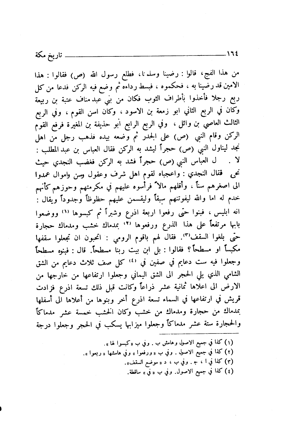 مِنْ هَذَا الْفَجِّ. قَالُوا: رَضِينَا وَسَلَّمْنَا. فَطَلَعَ رَسُولُ اللَّهِ صَلَّى اللهُ عَلَيْهِ وَسَلَّمَ، فَقَالُوا: هَذَا الْأَمِينُ، قَدْ رَضِينَا بِهِ. فَحَكَّمُوهُ، فَبَسَطَ رِدَاءَهُ، ثُمَّ وَضَعَ فِيهِ الرُّكْنَ، فَدَعَا مِنْ كُلِّ رُبْعٍ رَجُلًا، فَأَخَذُوا بِأَطْرَافِ الثَّوْبِ، فَكَانَ مِنْ بَنِي عَبْدِ مَنَافٍ عُتْبَةُ بْنُ رَبِيعَةَ، وَكَانَ فِي الرُّبُعِ الثَّانِي أَبُو زَمْعَةَ بْنُ الْأَسْوَدِ، وَكَانَ أَسَنَّ الْقَوْمِ، وَفِي الرُّبُعِ الثَّالِثِ الْعَاصِي بْنُ وَائِلٍ، وَفِي الرُّبُعِ الرَّابِعِ أَبُو حُذَيْفَةَ بْنُ الْمُغِيرَةِ، فَرَفَعَ الْقَوْمُ الرُّكْنَ، وَقَامَ النَّبِيُّ صَلَّى اللهُ عَلَيْهِ وَسَلَّمَ عَلَى الْجَدْرِ، ثُمَّ وَضَعَهُ بِيَدِهِ، فَذَهَبَ رَجُلٌ مِنْ أَهْلِ نَجْدٍ لِيُنَاوِلَ النَّبِيَّ صَلَّى اللهُ عَلَيْهِ وَسَلَّمَ حَجَرًا لِيَشُدَّ بِهِ الرُّكْنَ، فَقَالَ الْعَبَّاسُ بْنُ عَبْدِ الْمُطَّلِبِ: لَا. فَنَاوَلَ الْعَبَّاسُ النَّبِيَّ صَلَّى اللهُ عَلَيْهِ وَسَلَّمَ حَجَرًا، فَشَدَّ بِهِ الرُّكْنَ، فَغَضِبَ النَّجْدِيُّ حَيْثُ نُحِّيَ، فَقَالَ النَّجْدِيُّ: وَاعَجَبَاهُ لِقَوْمٍ أَهْلِ شَرَفٍ وَعُقُولٍ وَسِنٍّ وَأَمْوَالٍ، عَمَدُوا إِلَى أَصْغَرِهِمْ سِنًّا، وَأَقَلِّهِمْ مَالًا، فَرَأَسُوهُ عَلَيْهِمْ فِي مَكْرَمَتِهِمْ وَحَوْزِهِمْ، كَأَنَّهُمْ خَدَمٌ لَهُ، أَمَا وَاللَّهِ لَيَفُوتَنَّهُمْ سَبْقًا، وَلَيَقْسِمَنَّ عَلَيْهِمْ حُظُوظًا وَجُدُودًا. وَيُقَالُ: إِنَّهُ إِبْلِيسُ. فَبَنَوْا حَتَّى رَفَعُوا أَرْبَعَةَ أَذْرُعٍ وَشِبْرًا، ثُمَّ كَبَسُوهَا، وَوَضَعُوا بَابَهَا مُرْتَفِعًا عَلَى هَذَا الذَّرْعِ، وَرَفَعُوهَا بِمِدْمَاكِ خَشَبٍ وَمِدْمَاكِ حِجَارَةٍ حَتَّى بَلَغُوا السَّقْفَ، فَقَالَ لَهُمْ بَاقُومُ الرُّومِيُّ: أَتُحِبُّونَ أَنْ تَجْعَلُوا سَقْفَهَا مُكَبَّسًا أَوْ مُسَطَّحًا؟ فَقَالُوا: بَلِ ابْنِ بَيْتَ رَبِّنَا مُسَطَّحًا. قَالَ: فَبَنَوْهُ مُسَطَّحًا، وَجَعَلُوا فِيهِ سِتَّ دَعَائِمَ فِي صَفَّيْنِ، فِي كُلِّ صَفٍّ ثَلَاثُ دَعَائِمَ مِنَ الشِّقِّ الشَّامِيِّ الَّذِي يَلِي الْحَجَرَ إِلَى الشِّقِّ الْيَمَانِيِّ، وَجَعَلُوا ارْتِفَاعَهَا مِنْ خَارِجِهَا مِنَ الْأَرْضِ إِلَى أَعْلَاهَا ثَمَانِيَةَ عَشَرَ ذِرَاعًا، وَكَانَتْ قَبْلَ ذَلِكَ تِسْعَةَ أَذْرُعٍ، فَزَادَتْ قُرَيْشٌ فِي ارْتِفَاعِهَا فِي السَّمَاءِ تِسْعَةَ أَذْرُعٍ أُخَرَ، وَبَنَوْهَا مِنْ أَعْلَاهَا إِلَى أَسْفَلِهَا بِمِدْمَاكٍ مِنْ حِجَارَةٍ وَمِدْمَاكٍ مِنْ خَشَبٍ، وَكَانَ الْخَشَبُ خَمْسَةَ عَشَرَ مِدْمَاكًا، وَالْحِجَارَةُ سِتَّةَ عَشَرَ مِدْمَاكًا، وَجَعَلُوا مِيزَابَهَا يَسْكُبُ فِي الْحِجْرِ، وَجَعَلُوا دَرَجَةً
