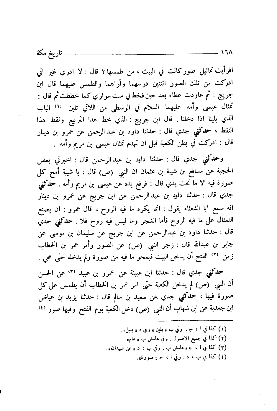 حَدَّثَنِي جَدِّي قَالَ: حَدَّثَنَا دَاوُدُ بْنُ عَبْدِ الرَّحْمَنِ، عَنْ عَمْرِو بْنِ دِينَارٍ قَالَ: §أَدْرَكْتُ فِي بَطْنِ الْكَعْبَةِ قَبْلَ أَنْ تُهْدَمَ تِمْثَالَ عِيسَى ابْنِ مَرْيَمَ وَأُمِّهِ "