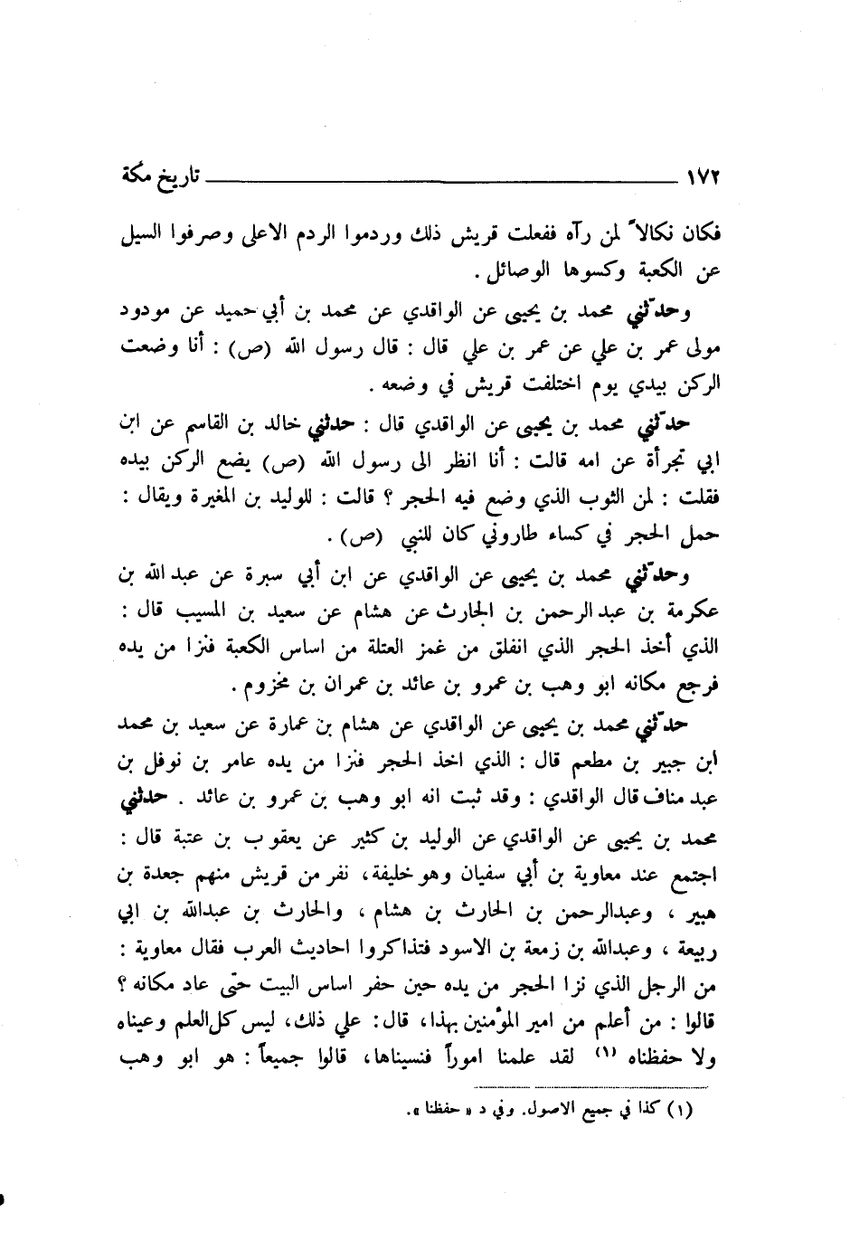 حَدَّثَنِي مُحَمَّدُ بْنُ يَحْيَى، عَنِ الْوَاقِدِيِّ، عَنْ هِشَامِ بْنِ عُمَارَةَ، عَنْ سَعِيدِ بْنِ مُحَمَّدِ بْنِ جُبَيْرِ بْنِ مُطْعِمٍ، قَالَ: «§الَّذِي أَخَذَ الْحَجَرَ فَنَزَا مِنْ يَدِهِ عَامِرُ بْنُ نَوْفَلِ بْنِ عَبْدِ مَنَافٍ» قَالَ الْوَاقِدِيُّ: «وَقَدْ ثَبَتَ أَنَّهُ أَبُو وَهْبِ بْنُ عَمْرِو بْنِ عَائِذٍ»