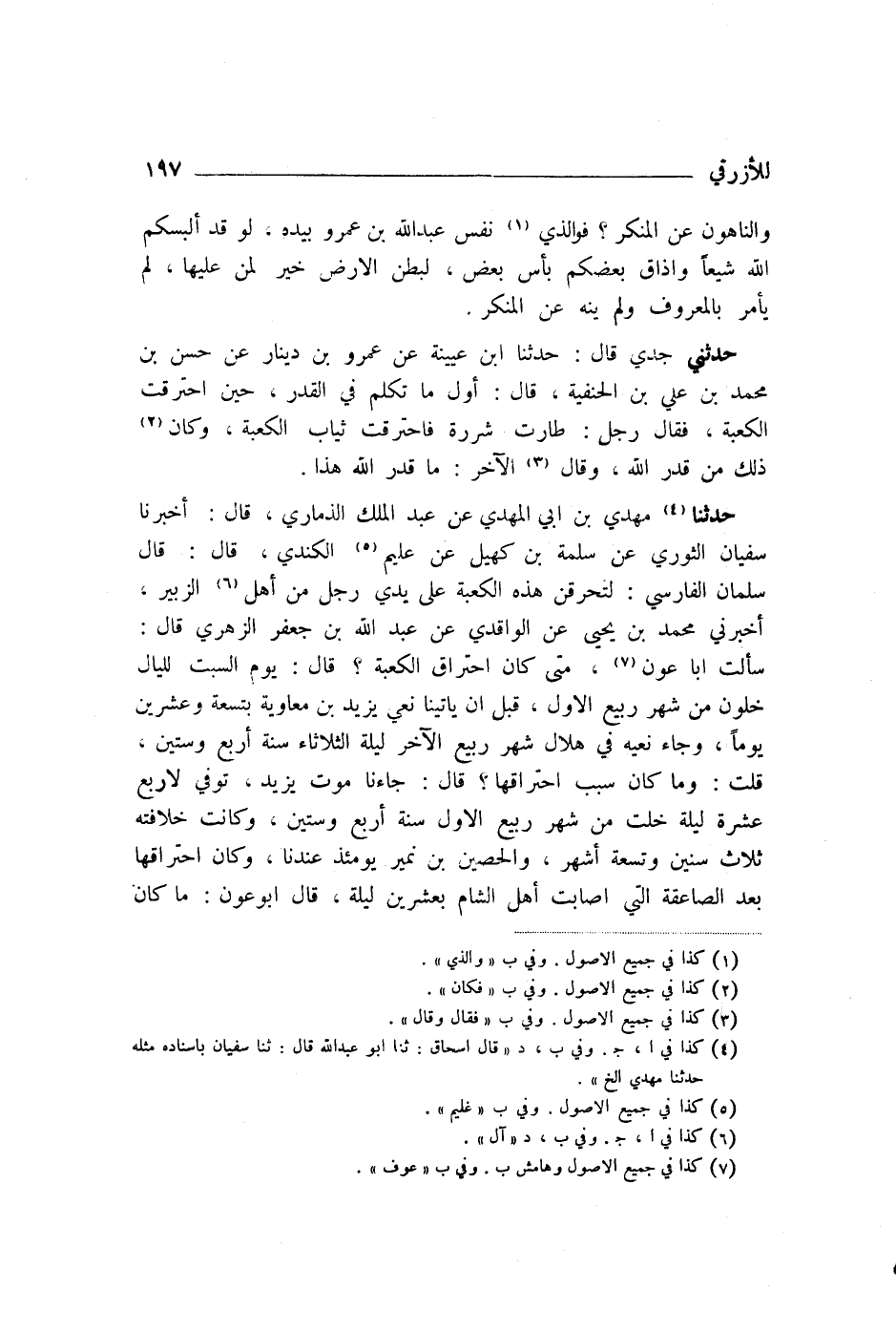 حَدَّثَنَا مَهْدِيُّ بْنُ أَبِي الْمَهْدِيِّ، عَنْ عَبْدِ الْمَلِكِ الذِّمَارِيِّ، قَالَ: أَخْبَرَنَا سُفْيَانُ الثَّوْرِيُّ، عَنْ سَلَمَةَ بْنِ كُهَيْلٍ، عَنْ عُلَيْمٍ الْكِنْدِيِّ، قَالَ: قَالَ سَلْمَانُ الْفَارِسِيُّ: «§لَتُحْرَقَنَّ هَذِهِ الْكَعْبَةُ عَلَى يَدَيْ رَجُلٍ مِنْ أَهْلِ الزُّبَيْرِ»