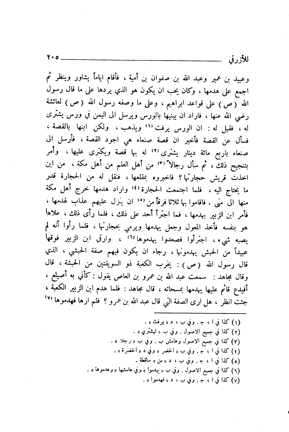 ، وَعُبَيْدُ بْنُ عُمَيْرٍ، وَعَبْدُ اللَّهِ بْنُ صَفْوَانَ بْنِ أُمَيَّةَ، فَأَقَامَ أَيَّامًا يُشَاوِرُ وَيَنْظُرُ، ثُمَّ أَجْمَعَ عَلَى هَدْمِهَا، وَكَانَ يُحِبُّ أَنْ يَكُونَ هُوَ الَّذِي يَرُدُّهَا عَلَى مَا قَالَ رَسُولُ اللَّهِ صَلَّى اللهُ عَلَيْهِ وَسَلَّمَ عَلَى قَوَاعِدِ إِبْرَاهِيمَ، وَعَلَى مَا وَصَفَهُ رَسُولُ اللَّهِ صَلَّى اللهُ عَلَيْهِ وَسَلَّمَ لِعَائِشَةَ رَضِيَ اللَّهُ عَنْهَا، فَأَرَادَ أَنْ يَبْنِيَهَا بِالْوَرْسِ، وَيُرْسِلَ إِلَى الْيَمَنِ فِي وَرْسٍ يُشْتَرَى لَهُ، فَقِيلَ لَهُ: إِنَّ الْوَرْسَ يَرْفِتُ وَيَذْهَبُ، وَلَكِنِ ابْنِهَا بِالْقَصَّةِ. فَسَأَلَ عَنِ الْقَصَّةِ فَأُخْبِرَ أَنَّ قَصَّةَ صَنْعَاءَ هِيَ أَجْوَدُ قَصَّةٍ، فَأَرْسَلَ إِلَى صَنْعَاءَ بِأَرْبَعِ مِائَةِ دِينَارٍ يُشْتَرَى لَهُ بِهَا قَصَّةٌ وَيُكْتَرَى عَلَيْهَا، وَأَمَرَ بِتَنْجِيحِ ذَلِكَ، ثُمَّ سَأَلَ رِجَالًا مِنْ أَهْلِ الْعِلْمِ مِنْ أَهْلِ مَكَّةَ مِنْ أَيْنَ أَخَذَتْ قُرَيْشٌ حِجَارَتَهَا، فَأَخْبَرُوهُ بِمَقْلَعِهَا، فَنُقِلَ لَهُ مِنَ الْحِجَارَةِ قَدْرُ مَا يُحْتَاجُ إِلَيْهِ، فَلَمَّا اجْتَمَعَتِ الْحِجَارَةُ وَأَرَادَ هَدْمَهَا خَرَجَ أَهْلُ مَكَّةَ مِنْهَا إِلَى مِنًى، فَأَقَامُوا بِهَا ثَلَاثًا؛ فَرَقًا مِنْ أَنْ يَنْزِلَ عَلَيْهِمْ عَذَابٌ لِهَدْمِهَا، فَأَمَرَ ابْنُ الزُّبَيْرِ بِهَدْمِهَا، فَمَا اجْتَرَأَ أَحَدٌ عَلَى ذَلِكَ، فَلَمَّا رَأَى ذَلِكَ عَلَاهَا هُوَ بِنَفْسِهِ، فَأَخَذَ الْمِعْوَلَ وَجَعَلَ يَهْدِمُهَا وَيَرْمِي بِحِجَارَتِهَا، فَلَمَّا رَأَوْا أَنَّهُ لَمْ يُصِبْهُ شَيْءٌ اجْتَرَءُوا، فَصَعِدُوا يَهْدِمُونَهَا، وَأَرْقَى ابْنُ الزُّبَيْرِ فَوْقَهَا عَبِيدًا مِنَ الْحَبَشِ يَهْدِمُونَهَا؛ رَجَاءَ أَنْ يَكُونَ فِيهِمْ صِفَةُ الْحَبَشِيِّ الَّذِي قَالَ رَسُولُ اللَّهِ صَلَّى اللهُ عَلَيْهِ وَسَلَّمَ: «يُخَرِّبُ الْكَعْبَةَ ذُو السُّوَيْقَتَيْنِ مِنَ الْحَبَشَةِ» . قَالَ: وَقَالَ مُجَاهِدٌ: سَمِعْتُ عَبْدَ اللَّهِ بْنَ عَمْرِو بْنِ الْعَاصِ يَقُولُ: كَأَنِّي بِهِ أُصَيْلِعُ أُفَيْدِعُ، قَائِمٌ عَلَيْهَا يَهْدِمُهَا بِمِسْحَاتِهِ. قَالَ مُجَاهِدٌ: فَلَمَّا هَدَمَ ابْنُ الزُّبَيْرِ الْكَعْبَةَ جِئْتُ أَنْظُرُ، هَلْ أَرَى الصِّفَةَ الَّتِي قَالَ عَبْدُ اللَّهِ بْنُ عَمْرٍو؟ فَلَمْ أَرَهَا، فَهَدَمُوهَا
