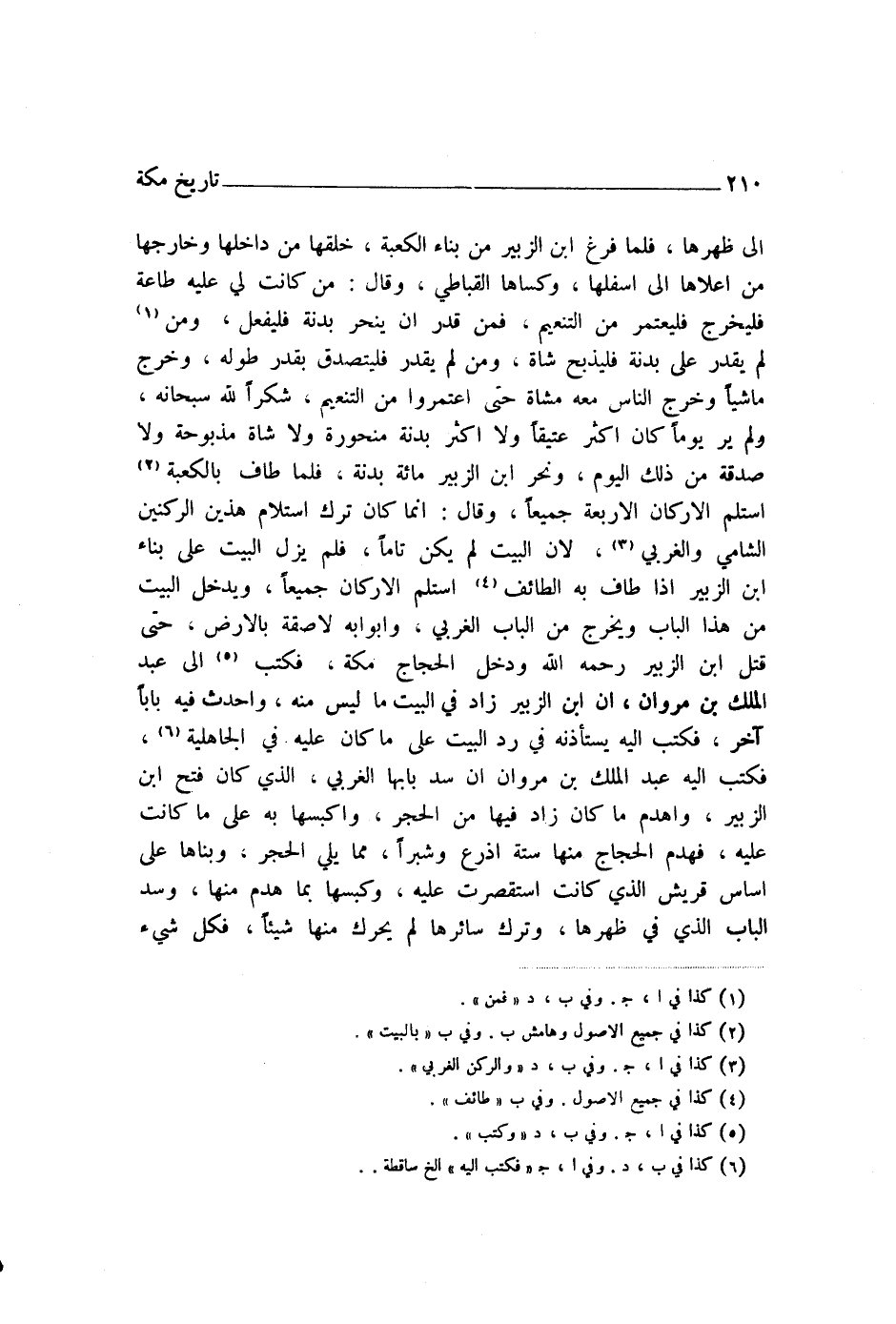 إِلَى ظَهْرِهَا، فَلَمَّا فَرَغَ ابْنُ الزُّبَيْرِ مِنْ بِنَاءِ الْكَعْبَةِ، خَلَّقَهَا مِنْ دَاخِلِهَا وَخَارِجِهَا، مِنْ أَعْلَاهَا وَأَسْفَلِهَا، وَكَسَاهَا الْقَبَاطِيَّ، وَقَالَ: مَنْ كَانَتْ لِي عَلَيْهِ طَاعَةٌ فَلْيَخْرُجْ، فَلْيَعْتَمِرْ مِنَ التَّنْعِيمِ، فَمَنْ قَدَرَ أَنْ يَنْحَرَ بَدَنَةً فَلْيَفْعَلْ، وَمَنْ لَمْ يَقْدِرْ عَلَى بَدَنَةٍ فَلْيَذْبَحْ شَاةً، وَمَنْ لَمْ يَقْدِرْ فَلْيَتَصَدَّقْ بِقَدْرِ طُولِهِ. وَخَرَجَ مَاشِيًا، وَخَرَجَ النَّاسُ مَعَهُ مُشَاةً، حَتَّى اعْتَمَرُوا مِنَ التَّنْعِيمِ؛ شُكْرًا لِلَّهِ سُبْحَانَهُ، وَلَمْ يُرَ يَوْمٌ كَانَ أَكْثَرَ عَتِيقًا، وَلَا أَكْثَرَ بَدَنَةً مَنْحُورَةً، وَلَا شَاةً مَذْبُوحَةً، وَلَا صَدَقَةً مِنْ ذَلِكَ الْيَوْمِ، وَنَحَرَ ابْنُ الزُّبَيْرِ مِائَةَ بَدَنَةٍ، فَلَمَّا طَافَ بِالْكَعْبَةِ اسْتَلَمَ الْأَرْكَانَ الْأَرْبَعَةَ جَمِيعًا، وَقَالَ: إِنَّمَا كَانَ تَرْكُ اسْتِلَامِ هَذَيْنِ الرُّكْنَيْنِ الشَّامِيِّ وَالْغَرْبِيِّ؛ لِأَنَّ الْبَيْتَ لَمْ يَكُنْ تَامًّا. فَلَمْ يَزَلِ الْبَيْتُ عَلَى بِنَاءِ ابْنِ الزُّبَيْرِ، إِذَا طَافَ بِهِ الطَّائِفُ اسْتَلَمَ الْأَرْكَانَ جَمِيعًا، وَيَدْخُلُ الْبَيْتَ مِنْ هَذَا الْبَابِ، وَيَخْرُجُ مِنَ الْبَابِ الْغَرْبِيِّ، وَأَبْوَابُهُ لَاصِقَةٌ بِالْأَرْضِ، حَتَّى قُتِلَ ابْنُ الزُّبَيْرِ رَحِمَهُ اللَّهُ، وَدَخَلَ الْحَجَّاجُ مَكَّةَ، فَكَتَبَ إِلَى عَبْدِ الْمَلِكِ بْنِ مَرْوَانَ: إِنَّ ابْنَ الزُّبَيْرِ زَادَ فِي الْبَيْتِ مَا لَيْسَ مِنْهُ، وَأَحْدَثَ فِيهِ بَابًا آخَرَ. فَكَتَبَ إِلَيْهِ يَسْتَأْذِنُهُ فِي رَدِّ الْبَيْتِ عَلَى مَا كَانَ عَلَيْهِ فِي الْجَاهِلِيَّةِ، فَكَتَبَ إِلَيْهِ عَبْدُ الْمَلِكِ بْنُ مَرْوَانَ أَنْ سُدَّ بَابَهَا الْغَرْبِيَّ الَّذِي كَانَ فَتْحَ ابْنُ الزُّبَيْرِ، وَاهْدِمْ مَا كَانَ زَادَ فِيهَا مِنَ الْحَجَرِ، وَاكْبِسْهَا بِهِ عَلَى مَا كَانَتْ عَلَيْهِ. فَهَدَمَ الْحَجَّاجُ مِنْهَا سِتَّةَ أَذْرُعٍ وَشِبْرًا مِمَّا يَلِي الْحَجَرَ، وَبَنَاهَا عَلَى أَسَاسِ قُرَيْشٍ الَّذِي كَانَتِ اسْتَقْصَرَتْ عَلَيْهِ، وَكَبَسَهَا بِمَا هَدَمَ مِنْهَا، وَسَدَّ الْبَابَ الَّذِي فِي ظَهْرِهَا، وَتَرَكَ سَائِرَهَا لَمْ يُحَرِّكْ مِنْهَا شَيْئًا، فَكُلُّ شَيْءٍ