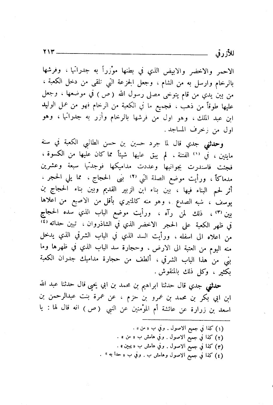 وَحَدَّثَنِي جَدِّي، قَالَ: «§لَمَّا جَرَّدَ حُسَيْنُ بْنُ حَسَنٍ الطَّالِبِيُّ الْكَعْبَةَ فِي سَنَةِ مِائَتَيْنِ فِي الْفِتْنَةِ، لَمْ يُبْقِ عَلَيْهَا شَيْئًا مِمَّا كَانَ عَلَيْهَا مِنَ الْكِسْوَةِ، فَجِئْتُ فَاسْتَدَرْتُ بِجَوَانِبِهَا، وَعَدَدْتُ مَدَامِيكَهَا، فَوَجَدْتُهَا سَبْعَةً وَعِشْرِينَ مِدْمَاكًا، وَرَأَيْتُ مَوْضِعَ الصِّلَةِ الَّتِي بَنَى الْحَجَّاجُ مِمَّا يَلِي الْحِجْرَ، أَثَرُ لَحْمِ الْبِنَاءِ فِيهَا، بَيْنَ بِنَاءِ ابْنِ الزُّبَيْرِ الْقَدِيمِ وَبَيْنَ بِنَاءِ الْحَجَّاجِ بْنِ يُوسُفَ، شِبْهُ الصَّدْعِ، وَهُوَ مِنْهُ كَالْمُتَبَرِّي بِأَقَلَّ مِنَ الْأُصْبُعِ مِنْ أَعْلَاهَا بَيْنَ ذَلِكَ لِمَنْ رَآهُ، وَرَأَيْتُ مَوْضِعَ الْبَابِ الَّذِي سَدَّهُ الْحَجَّاجُ فِي ظَهْرِ الْكَعْبَةِ عَلَى الْحَجَرِ الْأَخْضَرِ الَّذِي فِي الشَّاذَرْوَانِ، تَبِينُ حِدَاتُهُ مِنْ أَعْلَاهُ إِلَى أَسْفَلِهِ، وَرَأَيْتُ السَّدَّ الَّذِي فِي الْبَابِ الشَّرْقِيِّ الَّذِي يُدْخَلُ مِنْهُ الْيَوْمَ مِنَ الْعَتَبَةِ إِلَى الْأَرْضِ، وَحِجَارَةُ سَدِّ الْبَابِ الَّذِي فِي ظَهْرِهَا وَمَا بُنِيَ مِنْ هَذَا الْبَابِ الشَّرْقِيِّ، أَلْطَفُ مِنْ حِجَارَةِ مَدَامِيكِ جُدْرَانِ الْكَعْبَةِ بِكَثِيرٍ، وَكُلُّ ذَلِكَ بِالْمَنْقُوشِ»