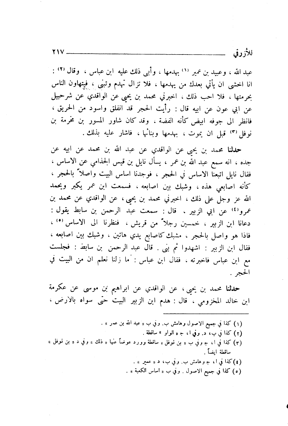 حَدَّثَنَا مُحَمَّدُ بْنُ يَحْيَى، عَنِ الْوَاقِدِيِّ، عَنْ إِبْرَاهِيمَ بْنِ مُوسَى، عَنْ عِكْرِمَةَ بْنِ خَالِدٍ الْمَخْزُومِيِّ، قَالَ: «§هَدَمَ ابْنُ الزُّبَيْرِ الْبَيْتَ حَتَّى سَوَّاهُ بِالْأَرْضِ -[218]-، وَحَفَرَ أَسَاسَهُ وَأَدْخَلَ الْحِجْرَ فِيهِ، وَكَانَ النَّاسُ يَطُوفُونَ مِنْ وَرَاءِ السِّتْرِ، وَيُصَلُّونَ إِلَى مَوْضِعِهِ، وَجَعَلَ الرُّكْنَ فِي تَابُوتٍ فِي سَرَقَةٍ مِنْ حَرِيرٍ، فَأَمَّا مَا كَانَ مِنْ حُلِيِّ الْبَيْتِ وَمَا وُجِدَ فِيهِ مِنْ ثِيَابٍ أَوْ طِيبٍ، فَإِنَّهُ جَعَلَهُ عِنْدَ الْحَجَبَةِ فِي خِزَانَةِ الْكَعْبَةِ، حَتَّى أَعَادَ بِنَاءَهَا» قَالَ عِكْرِمَةُ: فَرَأَيْتُ الْحَجَرَ الْأَسْوَدَ، فَإِذَا هُوَ ذِرَاعٌ أَوْ يَزِيدُ