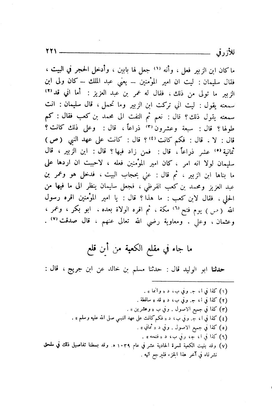 مَا كَانَ ابْنُ الزُّبَيْرِ فَعَلَ، وَأَنَّهُ جَعَلَ لَهَا بَابَيْنِ، وَأَدْخَلَ الْحِجْرَ فِي الْبَيْتِ، فَقَالَ سُلَيْمَانُ: لَيْتَ أَنَّ أَمِيرَ الْمُؤْمِنِينَ - يَعْنِي عَبْدَ الْمَلِكِ - كَانَ وَلَّى ابْنَ الزُّبَيْرِ مَا تَوَلَّى مِنْ ذَلِكَ. فَقَالَ لَهُ عُمَرُ بْنُ عَبْدِ الْعَزِيزِ: أَمَا إِنِّي قَدْ سَمِعْتُهُ يَقُولُ: لَيْتَ أَنِّي تَرَكْتُ ابْنَ الزُّبَيْرِ وَمَا تَحَمَّلَ. قَالَ سُلَيْمَانُ: أَنْتَ سَمِعْتَهُ يَقُولُ ذَلِكَ؟ قَالَ: نَعَمْ. ثُمَّ الْتَفَتَ إِلَى مُحَمَّدِ بْنِ كَعْبٍ، فَقَالَ: كَمْ طُولُهَا؟ قَالَ: سَبْعَةٌ وَعِشْرُونَ ذِرَاعًا. قَالَ: وَعَلَى ذَلِكَ كَانَتْ؟ قَالَ: لَا. قَالَ: فَكَمْ كَانَتْ؟ قَالَ: كَانَتْ عَلَى عَهْدِ النَّبِيِّ صَلَّى اللهُ عَلَيْهِ وَسَلَّمَ ثَمَانِيَةَ عَشَرَ ذِرَاعًا. قَالَ: فَمَنْ زَادَ فِيهَا؟ قَالَ: ابْنُ الزُّبَيْرِ. قَالَ سُلَيْمَانُ: لَوْلَا أَنَّهُ أَمْرٌ كَانَ أَمِيرُ الْمُؤْمِنِينَ فَعَلَهُ، لَأَحْبَبْتُ أَنْ أَرُدَّهَا عَلَى مَا بَنَاهَا ابْنُ الزُّبَيْرِ. ثُمَّ قَالَ: عَلَيَّ بِحُجَّابِ الْبَيْتِ. فَدَخَلَ هُوَ وَعُمَرُ بْنُ عَبْدِ الْعَزِيزِ، وَمُحَمَّدُ بْنُ كَعْبٍ الْقُرَظِيُّ، فَجَعَلَ سُلَيْمَانُ يَنْظُرُ إِلَى مَا فِيهَا مِنَ الْحُلِيِّ، فَقَالَ لِابْنِ كَعْبٍ: مَا هَذَا؟ قَالَ: يَا أَمِيرَ الْمُؤْمِنِينَ، «أَقَرَّهُ رَسُولُ اللَّهِ صَلَّى اللهُ عَلَيْهِ وَسَلَّمَ يَوْمَ فَتْحِ مَكَّةَ» ، ثُمَّ أَقَرَّهُ الْوُلَاةُ بَعْدَهُ أَبُو بَكْرٍ وَعُمَرُ وَعُثْمَانُ وَعَلِيٌّ وَمُعَاوِيَةُ رَضِيَ اللَّهُ تَعَالَى عَنْهُمْ. قَالَ: صَدَقْتَ