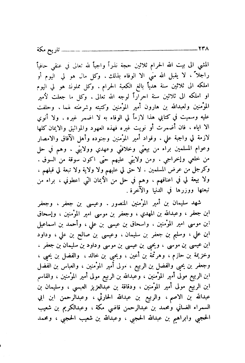 الْمَشْيُ إِلَى بَيْتِ اللَّهِ الْحَرَامِ ثَلَاثِينَ حَجَّةً نَذْرًا وَاجِبًا لِلَّهِ تَعَالَى فِي عُنُقِي حَافِيًا رَاجِلًا، وَلَا يَقْبَلُ اللَّهُ مِنِّي إِلَّا بِذَلِكَ، وَكُلُّ مَالٍ هُوَ لِي الْيَوْمَ أَوْ أَمْلِكُهُ إِلَى ثَلَاثِينَ سَنَةً هَدْيٌ بَالِغُ الْكَعْبَةِ الْحَرَامِ، وَكُلُّ مَمْلُوكٍ هُوَ لِي الْيَوْمَ أَوْ أَمْلِكُهُ إِلَى ثَلَاثِينَ سَنَةً أَحْرَارٌ لِوَجْهِ اللَّهِ تَعَالَى، وَكُلُّ مَا جَعَلْتُ لِأَمِيرِ الْمُؤْمِنِينَ وَلِعَبْدِ اللَّهِ بْنِ هَارُونَ أَمِيرِ الْمُؤْمِنِينَ وَكَتَبْتُهُ وَشَرَطْتُهُ لَهُمَا، وَحَلَفْتُ عَلَيْهِ وَسَمَّيْتُ فِي كِتَابِي هَذَا لَازِمٌ لِيَ الْوَفَاءُ بِهِ لَا أُضْمِرُ غَيْرَهُ، وَلَا أَنْوِي إِلَّا إِيَّاهُ، فَإِنْ أَضْمَرْتُ أَوْ نَوَيْتُ غَيْرَهُ فَهَذِهِ الْعُهُودُ وَالْمَوَاثِيقُ وَالْأَيْمَانُ كُلُّهَا لَازِمَةٌ لِي وَاجِبَةٌ عَلَيَّ، وَقُوَّادُ أَمِيرِ الْمُؤْمِنِينَ وَجُنُودُهُ وَأَهْلُ الْآفَاقِ وَالْأَمْصَارُ وَعَوَامُّ الْمُسْلِمِينَ بَرَاءٌ مِنْ بَيْعَتِي وَخِلَافَتِي وَعَهْدِي وَوِلَايَتِي، وَهُمْ فِي حِلٍّ مِنْ خَلْعِي وَإِخْرَاجِي مِنْ وِلَايَتِي عَلَيْهِمْ حَتَّى أَكُونَ سُوقَةً مِنَ السُّوقِ وَكَرَجُلٍ مِنْ عَرَضِ الْمُسْلِمِينَ، وَلَا حَقَّ لِي عَلَيْهِمْ وَلَا وِلَايَةَ تَبِعَةٍ لِي قِبَلَهُمْ وَلَا بَيْعَةَ لِي فِي أَعْنَاقِهِمْ، وَهُمْ فِي حِلٍّ مِنَ الْأَيْمَانِ الَّتِي أَعْطَوْنِي، بَرَاءٌ مِنْ تَبِعَتِهَا وَوِزْرِهَا فِي الدُّنْيَا وَالْآخِرَةِ. شَهِدَ سُلَيْمَانُ ابْنُ أَمِيرِ الْمُؤْمِنِينَ الْمَنْصُورِ، وَعِيسَى بْنُ جَعْفَرٍ، وَجَعْفَرُ بْنُ جَعْفَرٍ، وَعَبْدُ اللَّهِ بْنُ الْمَهْدِيِّ، وَجَعْفَرُ بْنُ مُوسَى أَمِيرُ الْمُؤْمِنِينَ وَإِسْحَاقُ بْنُ مُوسَى أَمِيرُ الْمُؤْمِنِينَ، وَإِسْحَاقُ بْنُ عِيسَى بْنِ عَلِيٍّ، وَأَحْمَدُ بْنُ إِسْمَاعِيلَ بْنِ عَلِيٍّ، وَسُلَيْمُ بْنُ جَعْفَرِ بْنِ سُلَيْمَانَ، وَعِيسَى بْنُ صَالِحِ بْنِ عَلِيٍّ، وَدَاوُدُ بْنُ عِيسَى بْنِ مُوسَى، وَيَحْيَى بْنُ عِيسَى بْنِ مُوسَى، وَدَاوُدُ بْنُ سُلَيْمَانَ بْنِ جَعْفَرٍ، وَخُزَيْمَةُ بْنُ حَازِمٍ، وَهَرْثَمَةُ بْنُ أَعْيَنَ، وَيَحْيَى بْنُ خَالِدٍ، وَالْفَضْلُ بْنُ يَحْيَى، وَجَعْفَرُ بْنُ يَحْيَى، وَالْفَضْلُ بْنُ الرَّبِيعِ مَوْلَى أَمِيرِ الْمُؤْمِنِينَ، وَالْعَبَّاسُ بْنُ الْفَضْلِ بْنِ الرَّبِيعِ مَوْلَى أَمِيرِ الْمُؤْمِنِينَ، وَعَبْدُ اللَّهِ بْنُ الرَّبِيعِ مَوْلَى أَمِيرِ الْمُؤْمِنِينَ، وَالْقَاسِمُ بْنُ الرَّبِيعِ مَوْلَى أَمِيرِ الْمُؤْمِنِينَ، وَدُقَاقَةُ بْنُ عَبْدِ الْعَزِيزِ الْعَبْسِيُّ، وَسُلَيْمَانُ بْنُ عَبْدِ اللَّهِ بْنِ الْأَصَمِّ، وَالرَّبِيعُ بْنُ عَبْدِ اللَّهِ الْحَارِثِيُّ، وَعَبْدُ الرَّحْمَنِ ابْنُ أَبِي السَّمْرَاءِ الْغَسَّانِيُّ وَمُحَمَّدُ بْنُ عَبْدِ الرَّحْمَنِ قَاضِي مَكَّةَ، وَعَبْدُ الْكَرِيمِ بْنُ شُعَيْبٍ الْحَجَبِيُّ، وَإِبْرَاهِيمُ بْنُ عَبْدِ اللَّهِ الْحَجَبِيُّ، وَعَبْدُ اللَّهِ بْنُ شُعَيْبٍ الْحَجَبِيُّ، وَمُحَمَّدُ