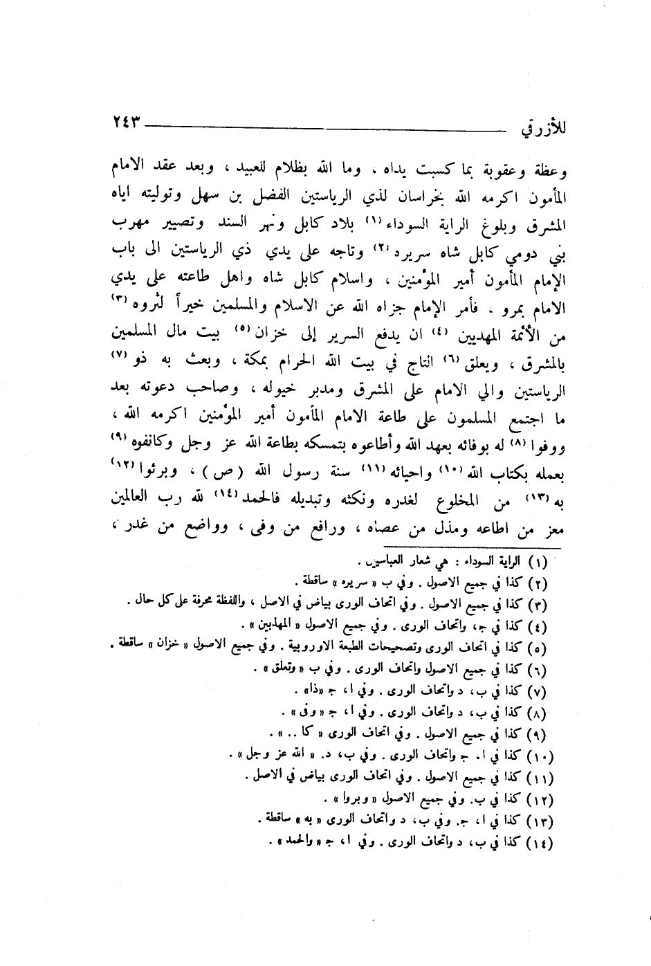وَعِظَةً وَعُقُوبَةً بِمَا كَسَبَتْ يَدَاهُ، وَمَا اللَّهُ بِظَلَّامٍ لِلْعَبِيدِ وَبَعْدَ عَقْدِ الْإِمَامِ الْمَأْمُونِ أَكْرَمَهُ اللَّهُ بِخُرَاسَانَ لِذِي الرِّيَاسَتَيْنِ الْفَضْلِ بْنِ سَهْلٍ وَتَوْلِيَتِهِ إِيَّاهُ الْمَشْرِقَ وَبُلُوغِ الرَّايَةِ السَّوْدَاءِ بِلَادَ كَابُلَ وَنَهْرَ السِّنْدِ وتَصْيِيرِ مَهْرَبِ بَنِي دُومِيِّ كَابُلَ شَاهَ سَرِيرَهُ وَتَاجَهُ عَلَى يَدَيْ ذِي الرِّيَاسَتَيْنِ إِلَى بَابِ الْإِمَامِ الْمَأْمُونِ أَمِيرِ الْمُؤْمِنِينَ، وَإِسْلَامِ كَابُلَ شَاهَ وَأَهْلِ طَاعَتِهِ عَلَى يَدَيِ الْإِمَامِ بِمَرْوَ، فَأَمَرَ الْإِمَامُ جَزَاهُ اللَّهُ عَنِ الْإِسْلَامِ وَالْمُسْلِمِينَ خَيْرًا لِثَرْوِهِ مِنَ الْأَئِمَّةِ الْمَهْدِيِّينَ أَنْ يُدْفَعَ السَّرِيرُ إِلَى خُزَّانِ بَيْتِ مَالِ الْمُسْلِمِينَ بِالْمَشْرِقِ، وَيُعَلَّقَ التَّاجُ فِي بَيْتِ اللَّهِ الْحَرَامِ بِمَكَّةَ، وَبَعَثَ بِهِ ذُو الرِّيَاسَتَيْنِ وَالِي الْإِمَامِ عَلَى الْمَشْرِقِ وَمُدَبِّرُ خُيُولِهِ، وَصَاحِبُ دَعْوَتِهِ بَعْدَ مَا اجْتَمَعَ الْمُسْلِمُونَ عَلَى طَاعَةِ الْإِمَامِ الْمَأْمُونِ أَمِيرِ الْمُؤْمِنِينَ أَكْرَمَهُ اللَّهُ، وَوَفَّوْا لَهُ بِوَفَائِهِ بِعَهْدِ اللَّهِ وَأَطَاعُوهُ بِتَمَسُّكِهِ بِطَاعَةِ اللَّهِ عَزَّ وَجَلَّ وَكَانَفُوهُ بِعَمَلِهِ بِكِتَابِ اللَّهِ وَإِحْيَائِهِ سُنَّةَ رَسُولِ اللَّهِ صَلَّى اللهُ عَلَيْهِ وَسَلَّمَ، وَبَرِئُوا بِهِ مِنَ الْمَخْلُوعِ لِغَدْرِهِ وَنَكْثِهِ وَتْبَدِيلِهِ، فَالْحَمْدُ لِلَّهِ رَبِّ الْعَالَمِينَ مُعِزِّ مَنْ أَطَاعَهُ وَمُذِلِّ مَنْ عَصَاهُ، وَرَافِعِ مَنْ وَفَّى وَوَاضِعِ مَنْ غَدَرَ