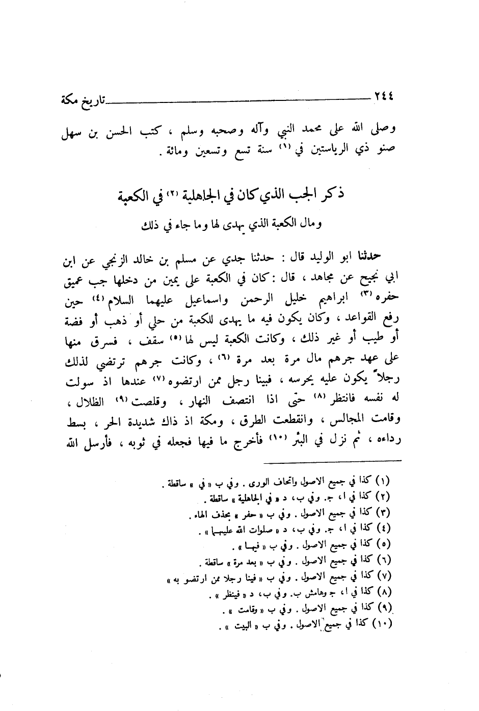 حَدَّثَنَا جَدِّي، عَنْ مُسْلِمِ بْنِ خَالِدٍ الزَّنْجِيِّ، عَنِ ابْنِ أَبِي نَجِيحٍ، عَنْ مُجَاهِدٍ، قَالَ: «§كَانَ فِي الْكَعْبَةِ عَلَى يَمِينِ مَنْ دَخَلَهَا جُبٌّ عَمِيقٌ حَفَرَهُ إِبْرَاهِيمُ خَلِيلُ الرَّحْمَنِ وَإِسْمَاعِيلُ عَلَيْهِمَا السَّلَامُ حِينَ رَفَعَ الْقَوَاعِدَ، وَكَانَ يَكُونُ فِيهِ مَا يُهْدَى لِلْكَعْبَةِ مِنْ حُلِيٍّ أَوْ ذَهَبٍ أَوْ فِضَّةٍ أَوْ طِيبٍ أَوْ غَيْرِ ذَلِكَ، وَكَانَتِ الْكَعْبَةُ لَيْسَ لَهَا سَقْفٌ، فَسُرِقَ مِنْهَا عَلَى عَهْدِ جُرْهُمٍ مَالٌ مَرَّةً بَعْدَ مَرَّةٍ، وَكَانَتْ جُرْهُمٌ تَرْتَضِي لِذَلِكَ رَجُلًا يَكُونُ عَلَيْهِ يَحْرُسُهُ، فَبَيْنَا رَجُلٌ مِمَّنَ ارْتَضَوْهُ عِنْدَهَا إِذْ سَوَّلَتْ لَهُ نَفْسُهُ فَانْتَظَرَ حَتَّى إِذَا انْتَصَفَ النَّهَارُ، وَقَلِصَتِ الظِّلَالُ، وَقَامَتِ الْمَجَالِسُ، وَانْقَطَعَتِ الطُّرُقُ، وَمَكَّةُ إِذْ ذَاكَ شَدِيدَةُ الْحَرِّ، بَسَطَ رِدَاءَهُ، ثُمَّ نَزَلَ فِي الْبِئْرِ، فَأَخْرَجَ مَا فِيهَا فَجَعَلَهُ فِي ثَوْبِهِ، فَأَرْسَلَ اللَّهُ