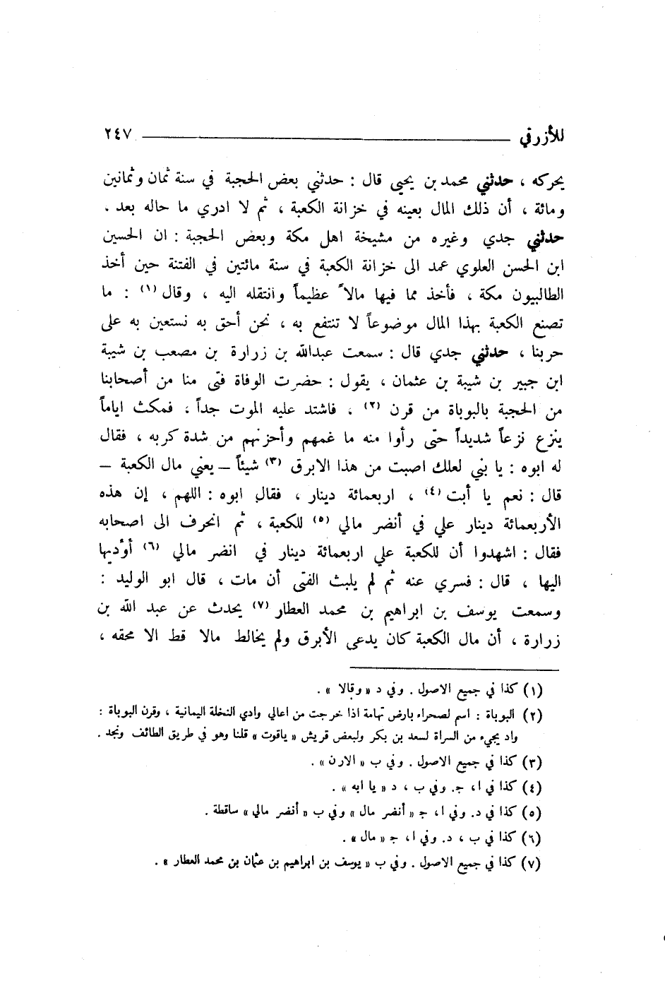 قَالَ أَبُو الْوَلِيدِ: وَسَمِعْتُ يُوسُفَ بْنَ إِبْرَاهِيمَ بْنِ مُحَمَّدٍ الْعَطَّارَ يُحَدِّثُ عَنْ عَبْدِ اللَّهِ بْنِ زُرَارَةَ " أَنَّ §مَالَ الْكَعْبَةِ كَانَ يُدْعَى الْأَبْرَقَ وَلَمْ يُخَالِطْ مَالًا قَطُّ إِلَّا مَحَقَهُ -[248]-، وَلَمْ يَرْزَأْ أَحَدٌ مِنْهُ قَطُّ مِنْ أَصْحَابِنَا إِلَّا بَانَ النَّقْصُ فِي مَالِهِ، وَأَدْنَى مَا يُصِيبُ صَاحِبَهُ أَنْ يُشَدَّدَ عَلَيْهِ الْمَوْتُ قَالَ: ولَمْ يَزَلْ مَنْ مَضَى مِنْ مَشْيَخَةَ الْحَجَبَةِ يُحَذِّرُونَهُ أَبْنَاءَهُمْ وَيُخَوِّفُونَهُمْ إِيَّاهُ وَيُوصُونَهُمْ بِالتَّنَزُّهِ عَنْهُ، وَيَقُولُونَ: لَنْ تَزَالُوا بِخَيْرٍ مَا دُمْتُمْ أَعِفَّةً عَنْهُ وَإِنْ كَانَ الرَّجُلُ لَيُصِيبُ مِنْهُ الشَّيْءَ فَيَضَعُهُ عِنْدَ النَّاسِ "