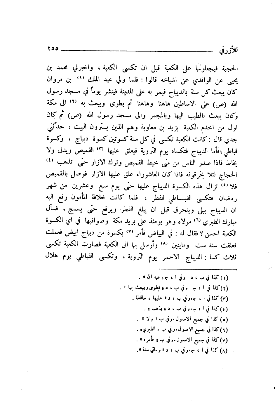حَدَّثَنِي جَدِّي قَالَ: " كَانَتِ الْكَعْبَةُ §تُكْسَى فِي كُلِّ سَنَةً كِسْوَتَيْنِ: كِسْوَةَ دِيبَاجٍ، وَكِسْوَةَ قَبَاطِيٍّ، فَأَمَّا الدِّيبَاجُ فَتُكْسَاهُ يَوْمَ التَّرْوِيَةِ، فَيُعَلَّقُ عَلَيْهَا الْقَمِيصُ وَيُدَلَّى وَلَا يُخَاطُ، فَإِذَا صَدَرَ النَّاسُ مِنْ مِنًى خِيطَ الْقَمِيصُ وَتُرِكَ الْإِزَارُ حَتَّى تَذْهَبَ الْحُجَّاجُ؛ لِئَلَّا يَخْرِقُوهُ، فَإِذَا كَانَ الْعَاشُورَاءُ عُلِّقَ عَلَيْهَا الْإِزَارُ فَوُصِلَ بِالْقَمِيصِ، فَلَا تَزَالُ هَذِهِ الْكِسْوَةُ الدِّيبَاجُ عَلَيْهَا حَتَّى يَوْمِ سَبْعٍ وَعِشْرِينَ مِنْ شَهْرِ رَمَضَانَ، فَتُكْسَى الْقَبَاطِيَّ لِلْفِطْرِ، فَلَمَّا كَانَتْ خِلَافَةُ الْمَأْمُونِ رُفِعَ إِلَيْهِ أَنَّ الدِّيبَاجَ يَبْلَى وَيَتَخَرَّقُ قَبْلَ أَنْ يَبْلُغَ الْفِطْرَ، وَيُرْقَعُ حَتَّى يَسْمُجَ، فَسَأَلَ مُبَارَكًا الطَّبَرِيَّ مَوْلَاهُ وَهُوَ يَوْمَئِذٍ عَلَى بَرِيدِ مَكَّةَ وَصَوَافِيهَا: فِي أَيِّ الْكِسْوَةِ الْكَعْبَةُ أَحْسَنُ؟ فَقَالَ لَهُ: فِي الْبَيَاضِ. فَأَمَرَ بِكِسْوَةٍ مِنْ دِيبَاجٍ أَبْيَضَ فَعُمِلَتْ، فَعُلِّقَتْ سَنَةَ سِتٍّ وَمِائَتَيْنِ، وَأَرْسَلَ بِهَا إِلَى الْكَعْبَةِ، فَصَارَتِ الْكَعْبَةُ تُكْسَى ثَلَاثَ كُسًا: الدِّيبَاجَ الْأَحْمَرَ يَوْمَ التَّرْوِيَةِ، وَتُكْسَى الْقَبَاطِيَّ يَوْمَ هِلَالِ