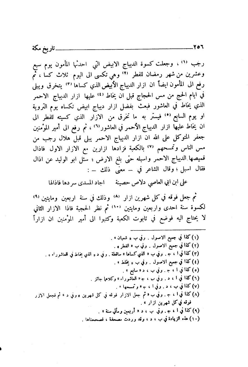 رَجَبٍ، وَجُعِلَتْ كِسْوَةُ الدِّيبَاجِ الْأَبْيَضِ الَّتِي أَحْدَثَهَا الْمَأْمُونُ يَوْمَ سَبْعٍ وَعِشْرِينَ مِنْ شَهْرِ رَمَضَانَ لِلْفِطْرِ، وَهِيَ تُكْسَى إِلَى الْيَوْمِ ثَلَاثَ كُسًا. ثُمَّ رُفِعَ إِلَى الْمَأْمُونِ أَيْضًا أَنَّ إِزَارَ الدِّيبَاجِ الْأَبْيَضِ الَّذِي كَسَاهَا يَتَخَرَّقُ وَيَبْلَى فِي أَيَّامِ الْحَجِّ مِنْ مَسِّ الْحُجَّاجِ قَبْلَ أَنْ يُخَاطَ عَلَيْهَا إِزَارُ الدِّيبَاجِ الْأَحْمَرِ الَّذِي يُخَاطُ فِي الْعَاشُورِ، فَبَعَثَ بِفَضْلِ إِزَارِ دِيبَاجٍ أَبْيَضَ تُكْسَاهُ يَوْمَ التَّرْوِيَةِ أَوْ يَوْمَ السَّابِعِ، فَيُسْتَرُ بِهِ مَا تَخَرَّقَ مِنَ الْإِزَارِ الَّذِي كُسِيَتْهُ لِلْفِطْرِ، إِلَى أَنْ يُخَاطَ عَلَيْهَا إِزَارُ الدِّيبَاجِ الْأَحْمَرِ فِي الْعَاشُورِ. ثُمَّ رُفِعَ إِلَى أَمِيرِ الْمُؤْمِنِينَ جَعْفَرٍ الْمُتَوَكِّلِ عَلَى اللَّهِ أَنَّ إِزَارَ الدِّيبَاجِ الْأَحْمَرِ يَبْلَى قَبْلَ هِلَالِ رَجَبٍ مِنْ مَسِّ النَّاسِ وَتَمَسُّحِهِمْ بِالْكَعْبَةِ، فَزَادَهَا إِزَارَيْنِ مَعَ الْإِزَارِ الْأَوَّلِ، فَأَذَالَ قَمِيصَهَا الدِّيبَاجَ الْأَحْمَرَ وَأَسْبَلَهُ حَتَّى بَلَغَ الْأَرْضَ " سُئِلَ أَبُو الْوَلِيدِ عَنْ أَذَالَ، فَقَالَ: أَسْبَلَ، وَقَالَ الشَّاعِرُ فِي مَعْنَى ذَلِكَ: