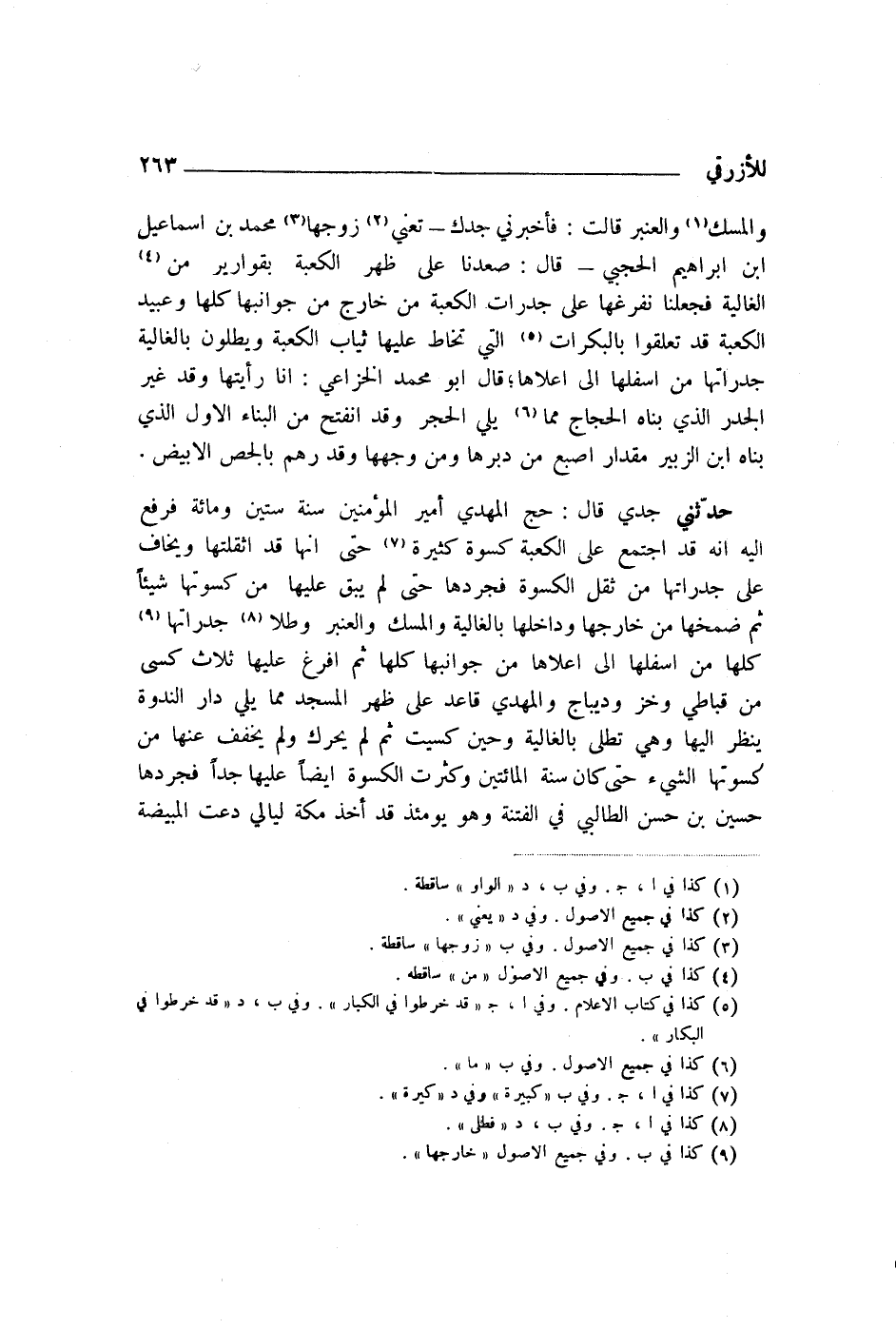حَدَّثَنَا جَدِّي، قَالَ: " حَجَّ الْمَهْدِيُّ أَمِيرُ الْمُؤْمِنِينَ سَنَةَ سِتِّينَ وَمِائَةٍ، فَرُفِعَ إِلَيْهِ أَنَّهُ قَدِ اجْتَمَعَ عَلَى الْكَعْبَةِ كِسْوَةٌ كَثِيرَةٌ، حَتَّى إِنَّهَا قَدْ أَثْقَلَتْهَا، وَيُخَافُ عَلَى جُدُرَاتِهَا مِنْ ثِقَلِ الْكِسْوَةِ، §فَجَرَّدَهَا حَتَّى لَمْ يُبْقِ عَلَيْهَا مِنْ كِسْوَتِهَا شَيْئًا، ثُمَّ ضَمَّخَهَا مِنْ خَارِجِهَا بِالْغَالِيَةِ وَالْمِسْكِ وَالْعَنْبَرِ، وَطَلَى جُدُرَاتِهَا كُلَّهَا مِنْ أَسْفَلِهَا إِلَى أَعْلَاهَا مِنْ جَوَانِبِهَا كُلِّهَا، ثُمَّ أَفْرَغَ عَلَيْهَا ثَلَاثَ كُسًا مِنْ قَبَاطِيٍّ وَخَزٍّ وَدِيبَاجٍ، وَالْمَهْدِيُّ قَاعِدٌ عَلَى ظَهْرِ الْمَسْجِدِ مِمَّا يَلِي دَارَ النَّدْوَةِ يَنْظُرُ إِلَيْهَا وَهِيَ تُطْلَى بِالْغَالِيَةِ وَحِينَ كُسِيَتْ. ثُمَّ لَمْ يُحَرَّكْ وَلَمْ يُخَفَّفْ عَنْهَا مِنْ كِسْوَتِهَا شَيْءٌ حَتَّى كَانَ سَنَةَ الْمِائَتَيْنِ، وَكَثُرَتِ الْكِسْوَةُ أَيْضًا عَلَيْهَا جِدًّا، فَجَرَّدَهَا حُسَيْنُ بْنُ حَسَنٍ الطَّالِبِيُّ فِي الْفِتْنَةِ، وَهُوَ يَوْمَئِذٍ قَدْ أَخَذَ مَكَّةَ لَيَالِيَ دَعَتِ الْمُبَيِّضَةُ -[264]- إِلَى أَنْفُسِهَا وَأَخَذُوا مَكَّةَ، فَجَرَّدَهَا حَتَّى لَمْ يُبْقِ عَلَيْهَا مِنْ كِسْوَتِهَا شَيْئًا. قَالَ جَدِّي: فَاسْتَدَرْتُ بِجَوَانِبِهَا وَهِيَ مُجَرَّدَةٌ، فَرَأَيْتُ جُدَّاتِ الْبَابِ الَّذِي كَانَ ابْنُ الزُّبَيْرِ جَعَلَهُ فِي ظَهْرِهَا، وَسَدَّهُ الْحَجَّاجُ بِأَمْرِ عَبْدِ الْمَلِكِ، فَرَأَيْتُ جُدَّاتِهِ وَعَتَبَهُ عَلَى حَالِهَا، وَعَدَدْتُ حِجَارَتَهُ الَّتِي سُدَّ بِهَا فَوَجَدْتُهَا ثَمَانِيَةً وَعِشْرِينَ حَجَرًا فِي تِسْعَةِ مَدَامِيكَ، فِي كُلِّ مِدْمَاكٍ ثَلَاثَةُ أَحْجَارٍ، إِلَّا الْمِدْمَاكَ الْأَعْلَى، فَإِنَّ فِيهِ أَرْبَعَةَ أَحْجَارٍ، رَأَيْتُ الصِّلَةَ الَّتِي بَنَى الْحَجَّاجُ مِمَّا يَلِي الْحِجْرَ حِينَ هَدَمَ مَا زَادَ ابْنُ الزُّبَيْرِ. قَالَ: فَرَأَيْتُ تِلْكَ الصِّلَةَ بَيِّنَةً فِي الْجَدْرِ، وَهِيَ كَالْمُتَبَرِيَّةِ مِنَ الْجَدْرِ الْآخَرِ. قَالَ إِسْحَاقُ: وَرَأَيْتُ جُدُرَاتِهَا كَلَوْنِ الْعَنْبَرِ الْأَشْهَبِ حِينَ جُرِّدَتْ فِي آخِرِ ذِي الْحِجَّةِ مِنْ سَنَةِ ثَلَاثٍ وَسِتِّينَ وَمِائَتَيْنِ، وَأَحْسِبُهُ مِنْ تِلْكَ الْغَالِيَةِ. قَالَ: وَكَانَ تَجْرِيدُ الْحُسَيْنِ بْنِ الْحَسَنِ إِيَّاهَا أَوَّلَ يَوْمٍ مِنَ الْمُحَرَّمِ يَوْمَ السَّبْتِ سَنَةَ مِائَتَيْنِ، ثُمَّ كَسَاهَا حُسَيْنُ بْنُ الْحَسَنِ كِسْوَتَيْنِ مِنْ قَزٍّ رَقِيقٍ، إِحْدَاهُمَا صَفْرَاءُ، وَالْأُخْرَى بَيْضَاءُ، مَكْتُوبٌ بَيْنَهُمَا بِسْمِ اللَّهِ الرَّحْمَنِ الرَّحِيمِ، وَصَلَّى اللَّهُ عَلَى مُحَمَّدٍ وَعَلَى أَهْلِ بَيْتِهِ الطَّيِّبِينَ الطَّاهِرِينَ الْأَخْيَارِ، أَمَرَ أَبُو السَّرَايَا الْأَصْفَرُ بْنُ الْأَصْفَرِ دَاعِيَةٌ إِلَى مُحَمَّدٍ بِعَمَلِ هَذِهِ الْكِسْوَةِ لِبَيْتِ اللَّهِ الْحَرَامِ " قَالَ أَبُو الْوَلِيدِ: وَابْتَدَأَتْ كِسْوَتُهَا مِنْ سَنَةِ الْمِائَتَيْنِ، وَعِدَّتُهَا إِلَى سَنَةِ أَرْبَعٍ وَأَرْبَعِينَ وَمِائَتَيْنِ مِائَةٌ وَسَبْعُونَ ثَوْبًا. قَالَ مُحَمَّدٌ الْخُزَاعِيُّ: وَأَنَا رَأَيْتُهَا وَقَدْ عُمِرَ الْجَدْرُ الَّذِي بَنَاهُ الْحَجَّاجُ مِمَّا يَلِي الْحِجْرَ، فَانْفَتَحَ -[265]- مِنَ الْبِنَاءِ الْأَوَّلِ الَّذِي بَنَاهُ ابْنُ الزُّبَيْرِ مِقْدَارُ نِصْفِ إِصْبَعٍ مِنْ وَجْهِهَا وَمِنْ دُبُرِهَا، وَقَدْ رُهِمَ بِالْجِصِّ الْأَبْيَضِ، وَقَدْ رَأَيْتُهَا حِينَ جُرِّدَتْ فِي آخِرِ ذِي الْحِجَّةِ سَنَةَ ثَلَاثٍ وَسِتِّينَ وَمِائَتَيْنِ، فَرَأَيْتُ جُدُرَاتِهَا كَلَوْنِ الْعَنْبَرِ ال