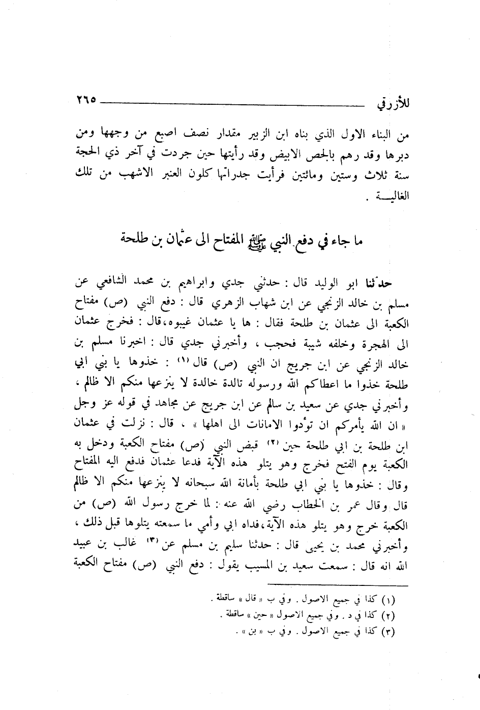 حَدَّثَنَا أَبُو الْوَلِيدِ قَالَ: حَدَّثَنِي جَدِّي، وَإِبْرَاهِيمُ بْنُ مُحَمَّدٍ الشَّافِعِيُّ، عَنْ مُسْلِمِ بْنِ خَالِدٍ الزَّنْجِيِّ، عَنِ ابْنِ شِهَابٍ الزُّهْرِيِّ، قَالَ: " دَفَعَ النَّبِيُّ صَلَّى اللهُ عَلَيْهِ وَسَلَّمَ §مِفْتَاحَ الْكَعْبَةِ إِلَى عُثْمَانَ بْنِ طَلْحَةَ، فَقَالَ: «هَا يَا عُثْمَانُ غَيِّبُوهُ» . قَالَ: فَخَرَجَ عُثْمَانُ إِلَى الْهِجْرَةِ، وَخَلَفَهُ شَيْبَةُ فَحَجَبَ "