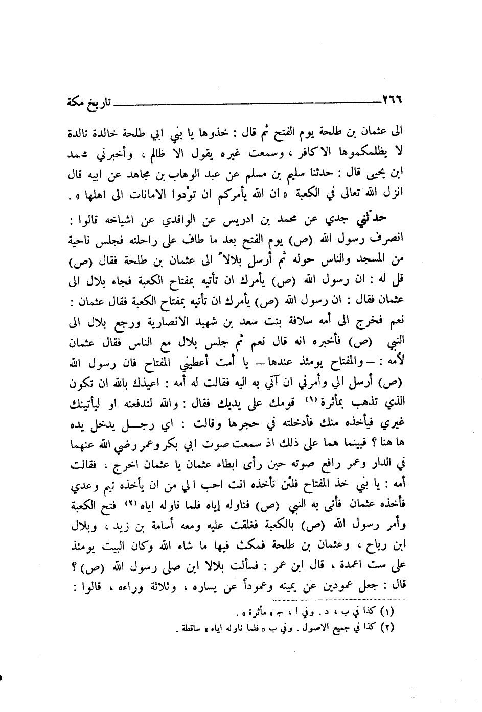 حَدَّثَنِي جَدِّي، عَنْ مُحَمَّدِ بْنِ إِدْرِيسَ، عَنِ الْوَاقِدِيِّ، عَنِ أَشْيَاخِهِ، قَالُوا: انْصَرَفَ رَسُولُ اللَّهِ صَلَّى اللهُ عَلَيْهِ وَسَلَّمَ §يَوْمَ الْفَتْحِ بَعْدَ مَا طَافَ عَلَى رَاحِلَتِهِ، فَجَلَسَ نَاحِيَةً مِنَ الْمَسْجِدِ وَالنَّاسُ حَوْلَهُ، ثُمَّ أَرْسَلَ بِلَالًا إِلَى عُثْمَانَ بْنِ طَلْحَةَ، فَقَالَ رَسُولُ اللَّهِ صَلَّى اللهُ عَلَيْهِ وَسَلَّمَ: " قُلْ لَهُ: إِنَّ رَسُولَ اللَّهِ صَلَّى اللهُ عَلَيْهِ وَسَلَّمَ يَأْمُرُكَ أَنْ تَأْتِيَهُ بِمِفْتَاحِ الْكَعْبَةِ " فَجَاءَ بِلَالٌ إِلَى عُثْمَانَ، فَقَالَ: إِنَّ رَسُولَ اللَّهِ صَلَّى اللهُ عَلَيْهِ وَسَلَّمَ يَأْمُرُكَ أَنْ تَأْتِيَهُ بِمِفْتَاحِ الْكَعْبَةِ. فَقَالَ عُثْمَانُ: نَعَمْ. فَخَرَجَ إِلَى أُمِّهِ سُلَافَةَ بِنْتِ سَعْدِ بْنِ شَهِيدٍ الْأَنْصَارِيَّةِ، وَرَجَعَ بِلَالٌ إِلَى النَّبِيِّ صَلَّى اللهُ عَلَيْهِ وَسَلَّمَ فَأَخْبَرَهُ أَنَّهُ قَالَ نَعَمْ، ثُمَّ جَلَسَ بِلَالٌ مَعَ النَّاسِ، فَقَالَ عُثْمَانُ لِأُمِّهِ - وَالْمِفْتَاحُ يَوْمَئِذٍ عِنْدَهَا -: يَا أُمَّتْ، أَعْطِينِي الْمِفْتَاحَ؛ فَإِنَّ رَسُولَ اللَّهِ صَلَّى اللهُ عَلَيْهِ وَسَلَّمَ أَرْسَلَ إِلَيَّ وَأَمَرَنِي أَنْ آتِيَ بِهِ إِلَيْهِ. فَقَالَتْ لَهُ أُمُّهُ: أُعِيذُكَ بِاللَّهِ أَنْ تَكُونَ الَّذِي تَذْهَبُ بِمَأْثَرَةِ قَوْمِكَ عَلَى يَدَيْكَ. فَقَالَ: وَاللَّهِ لَتَدْفَعِنَّهُ أَوْ لَيَأْتِيَنَّكِ غَيْرِي فَيَأْخُذُهُ مِنْكِ. فَأَدْخَلَتْهُ فِي حِجْرِهَا وَقَالَتْ: أَيُّ رَجُلٍ يُدْخِلُ يَدَهُ هَاهُنَا؟ فَبَيْنَمَا هُمَا عَلَى ذَلِكَ إِذْ سَمِعَتْ صَوْتَ أَبِي بَكْرٍ وَعُمَرَ رَضِيَ اللَّهُ عَنْهُمَا فِي الدَّارِ، وَعُمَرُ رَافِعٌ صَوْتَهُ حِينَ رَأَى إِبْطَاءَ عُثْمَانَ: يَا عُثْمَانُ اخْرُجْ. فَقَالَتْ أُمُّهُ: يَا بُنَيَّ خُذِ الْمِفْتَاحَ، فَلَأَنْ تَأْخُذَهُ أَنْتَ أَحَبُّ إِلَيَّ مِنْ أَنْ يَأْخُذَهُ تَيْمٌ وَعَدِيٌّ. فَأَخَذَهُ عُثْمَانُ، فَأَتَى النَّبِيَّ صَلَّى اللهُ عَلَيْهِ وَسَلَّمَ فَنَاوَلَهُ إِيَّاهُ، فَلَمَّا نَاوَلَهُ إِيَّاهُ فَتَحَ الْكَعْبَةَ، وَأَمَرَ رَسُولُ اللَّهِ صَلَّى اللهُ عَلَيْهِ وَسَلَّمَ بِالْكَعْبَةِ فَغُلِقَتْ عَلَيْهِ وَمَعَهُ أُسَامَةُ بْنُ زَيْدٍ، وَبِلَالُ بْنُ رَبَاحٍ، وَعُثْمَانُ بْنُ طَلْحَةَ، فَمَكَثَ فِيهَا مَا شَاءَ اللَّهُ، وَكَانَ الْبَيْتُ يَوْمَئِذٍ عَلَى سِتَّةِ أَعْمِدَةٍ. قَالَ ابْنُ عُمَرَ: فَسَأَلْتُ بِلَالًا أَيْنَ صَلَّى رَسُولُ اللَّهِ صَلَّى اللهُ عَلَيْهِ وَسَلَّمَ؟ قَالَ: جَعَلَ عَمُودَيْنِ عَنْ يَمِينِهِ، وَعَمُودًا عَنْ يَسَارِهِ، وَثَلَاثَةً وَرَاءَهُ. قَالُوا -[267]-: ثُمَّ خَرَجَ رَسُولُ اللَّهِ صَلَّى اللهُ عَلَيْهِ وَسَلَّمَ وَالْمِفْتَاحُ فِي يَدِهِ، وَوَقَفَ عَلَى الْبَابِ خَالِدُ بْنُ الْوَلِيدِ يَذُبُّ النَّاسَ عَنِ الْبَابِ حَتَّى خَرَجَ رَسُولُ اللَّهِ صَلَّى اللهُ عَلَيْهِ وَسَلَّمَ "
