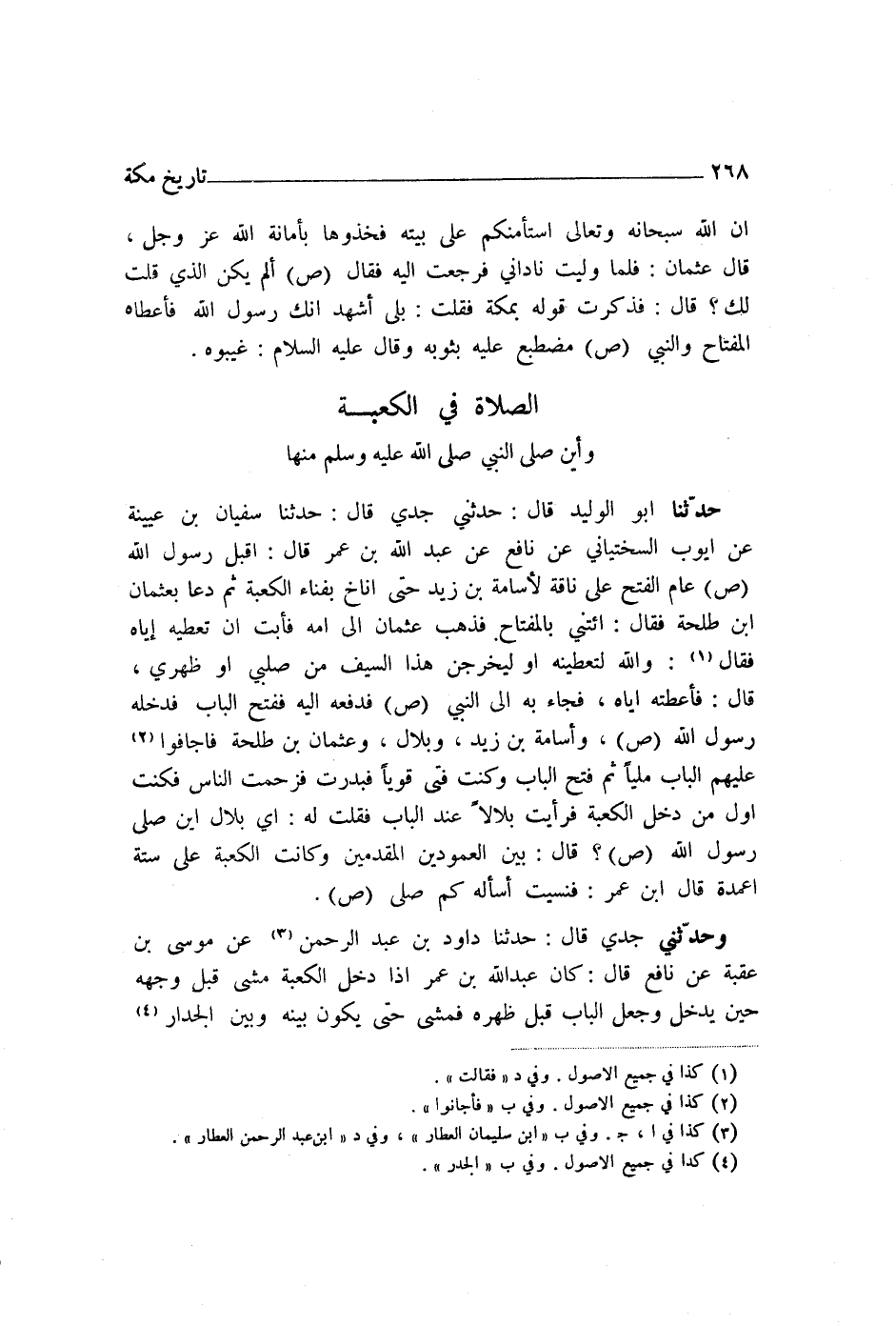حَدَّثَنَا أَبُو الْوَلِيدِ قَالَ: حَدَّثَنِي جَدِّي، قَالَ: حَدَّثَنَا سُفْيَانُ بْنُ عُيَيْنَةَ، عَنْ أَيُّوبَ السَّخْتِيَانِيِّ، عَنْ نَافِعٍ، عَنْ عَبْدِ اللَّهِ بْنِ عُمَرَ، قَالَ: أَقْبَلَ رَسُولُ اللَّهِ صَلَّى اللهُ عَلَيْهِ وَسَلَّمَ عَامَ الْفَتْحِ عَلَى نَاقَةٍ لِأُسَامَةَ بْنِ زَيْدٍ حَتَّى أَنَاخَ بِفِنَاءِ الْكَعْبَةِ، ثُمَّ دَعَا بِعُثْمَانَ بْنِ طَلْحَةَ، فَقَالَ: «ائْتِنِي بِالْمِفْتَاحِ» . فَذَهَبَ عُثْمَانُ إِلَى أُمِّهِ، فَأَبَتْ أَنْ تُعْطِيَهُ إِيَّاهُ، فَقَالَ: وَاللَّهِ لَتُعْطِيَنَّهُ أَوْ لَيَخْرُجَنَّ هَذَا السَّيْفُ مِنْ صُلْبِي أَوْ ظَهْرِي. قَالَ: فَأَعْطَتْهُ إِيَّاهُ، فَجَاءَ بِهِ إِلَى النَّبِيِّ صَلَّى اللهُ عَلَيْهِ وَسَلَّمَ فَدَفَعَهُ إِلَيْهِ، فَفَتَحَ الْبَابَ فَدَخَلَهُ رَسُولُ اللَّهِ صَلَّى اللهُ عَلَيْهِ وَسَلَّمَ، وَأُسَامَةُ بْنُ زَيْدٍ، وَبِلَالٌ، وَعُثْمَانُ بْنُ طَلْحَةَ، فَأَجَافُوا عَلَيْهِمُ الْبَابَ مَلِيًّا، ثُمَّ فُتِحَ الْبَابُ، وَكُنْتُ فَتًى قَوِيًّا، فَبَدَرْتُ فَزَحَمْتُ النَّاسَ، فَكُنْتُ أَوَّلَ مَنْ دَخَلَ الْكَعْبَةَ، فَرَأَيْتُ بِلَالًا عِنْدَ الْبَابِ، فَقُلْتُ لَهُ: أَيْ بِلَالُ، §أَيْنَ صَلَّى رَسُولُ اللَّهِ صَلَّى اللهُ عَلَيْهِ وَسَلَّمَ؟ قَالَ: بَيْنَ الْعَمُودَيْنِ الْمُقَدَّمَيْنِ. وَكَانَتِ الْكَعْبَةُ عَلَى سِتَّةِ أَعْمِدَةٍ. قَالَ ابْنُ عُمَرَ: فَنَسِيتُ أَسْأَلُهُ كَمْ صَلَّى صَلَّى اللهُ عَلَيْهِ وَسَلَّمَ "